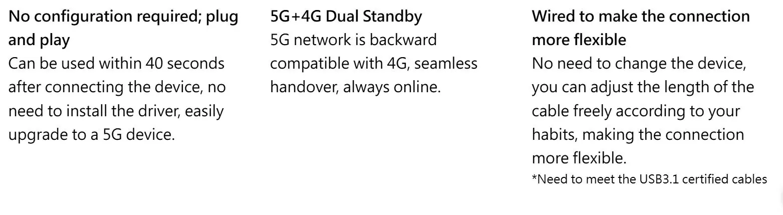 La tarjeta de red móvil 5G permite que su computadora portátil, tableta, computadora de escritorio y otros dispositivos de red alimentados por USB3.1 accedan a Internet a través de una conexión por cable, actualizando instantáneamente a dispositivos 5G. La conectividad no se ve afectada, las velocidades son rápidas y más seguras, adecuadas para transferencias de archivos grandes, descargas, streaming y juegos, etc.