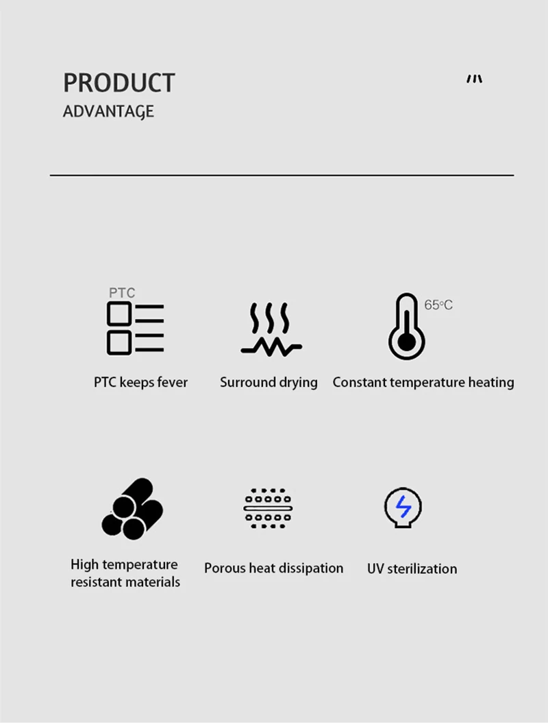3. La luz violeta incorporada y el elemento de calefacción PTC pueden destruir el entorno de vida de los microorganismos a través de alta temperatura y secado, quitar el olor e inhibir el crecimiento de microorganismos