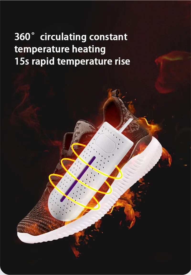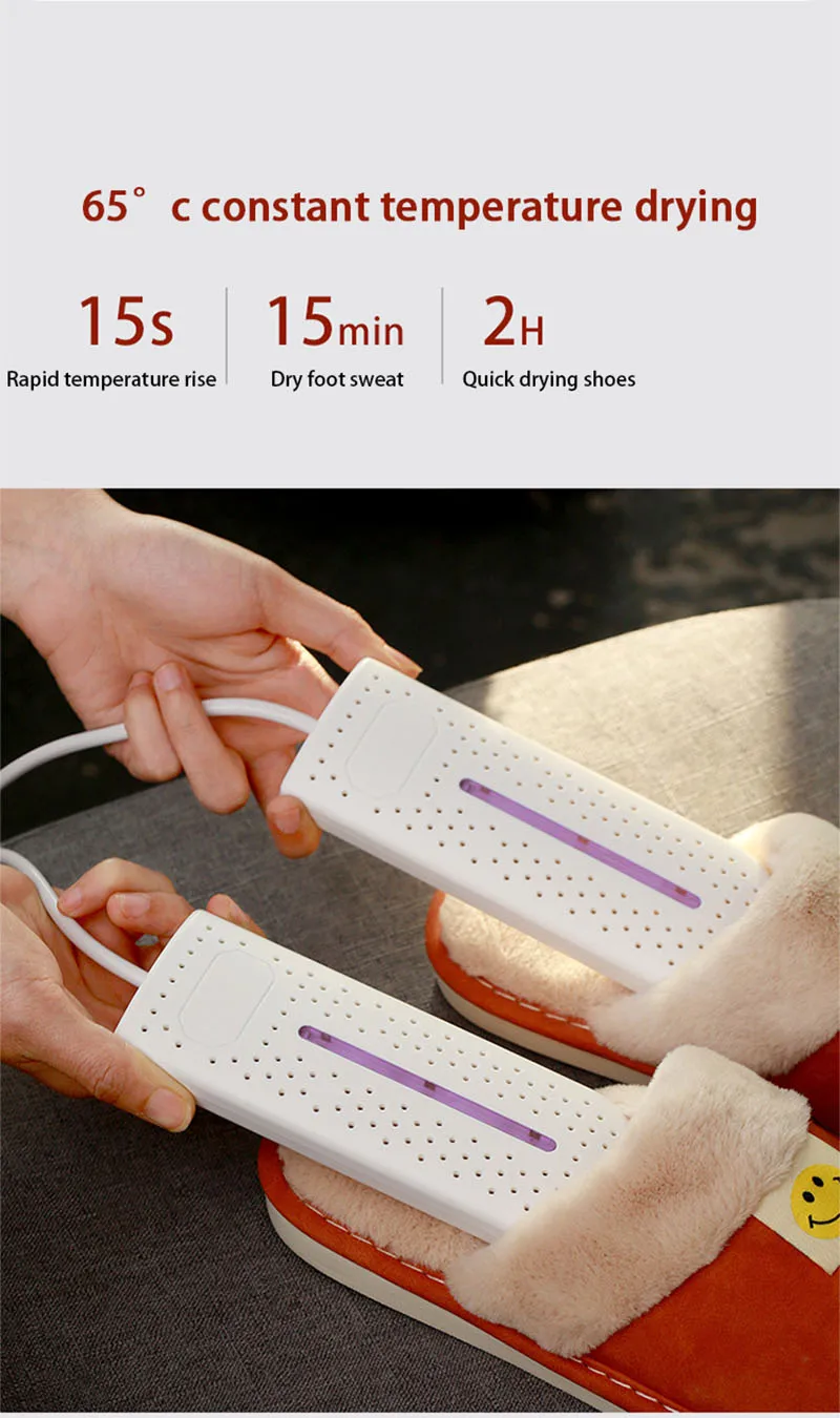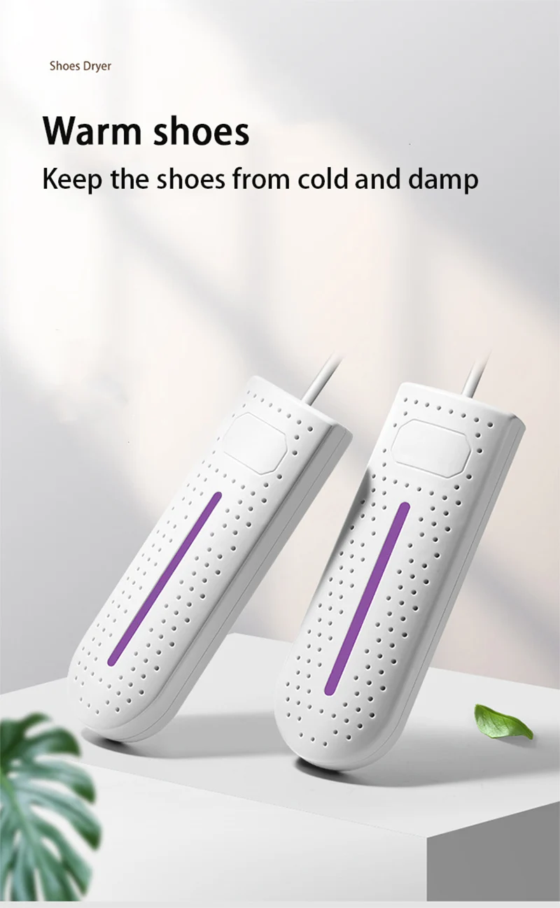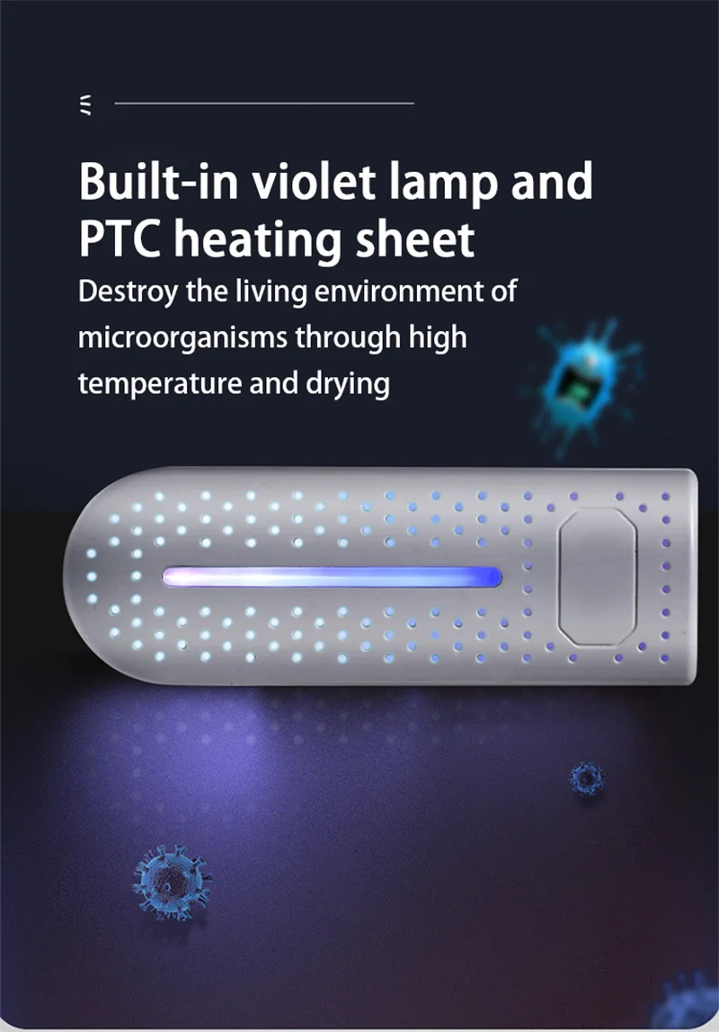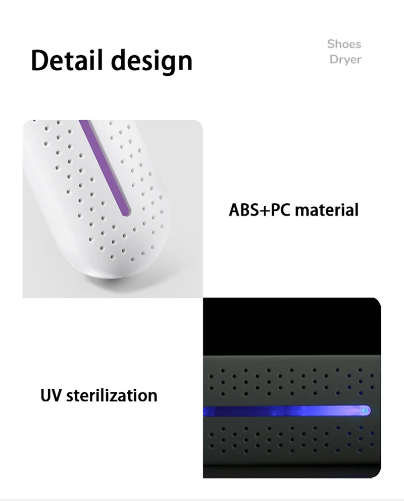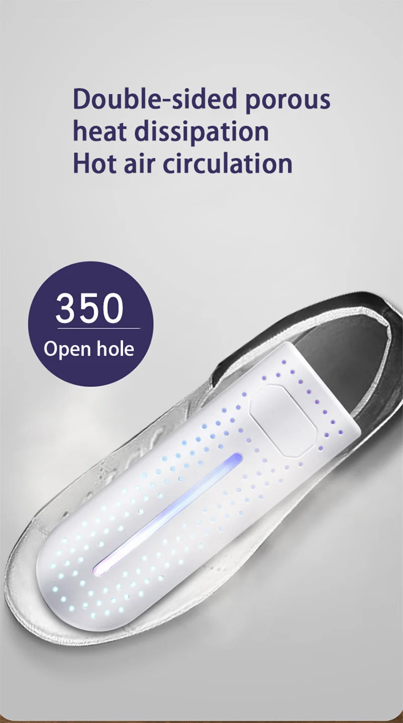 • Esterilización UV:El secador de zapatos utiliza la esterilización UV para matar las bacterias y los microorganismos que causan olores, manteniendo sus zapatos limpios y frescos.