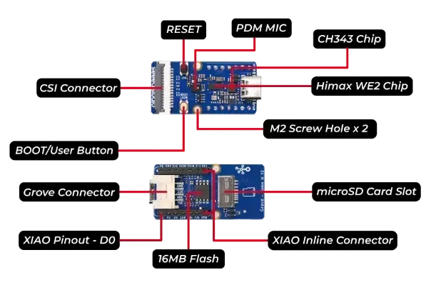 Grove Vision AI V2 no solo está diseñado para aplicaciones de visión, sino que también cuenta con un micrófono PDM integrado para aplicaciones de sonido.Viene con una ranura para tarjeta SD que permite el almacenamiento conveniente de imágenes, vídeos y resultados de identificación utilizando una tarjeta SD.