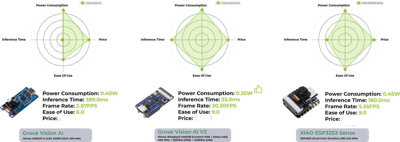 Para obtener una evaluación rápida del rendimiento de esta placa, la comparamos con las otras placas AI de visión basadas en MCU de Seeed: módulo AI Grove Vision, sensor XIAO ESP32S3 en cuatro áreas:
