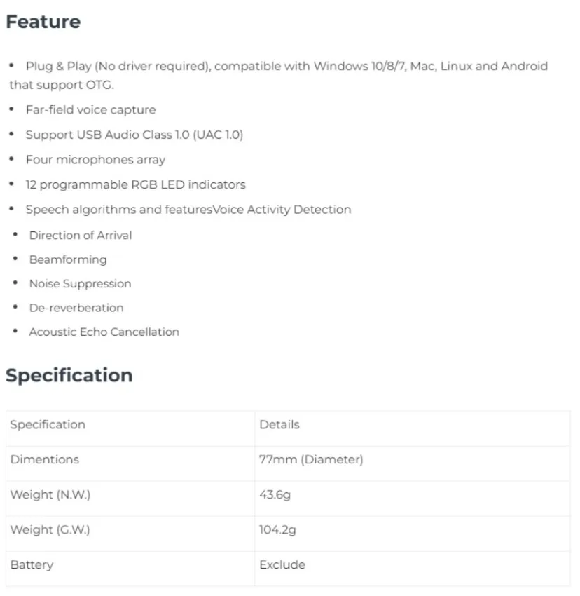 Presenta modos duales, 360°Captación de voz de campo lejano (hasta 5 m), AEC, AGC, DoA, VAD, desverberación, formación de haces y supresión de ruido.