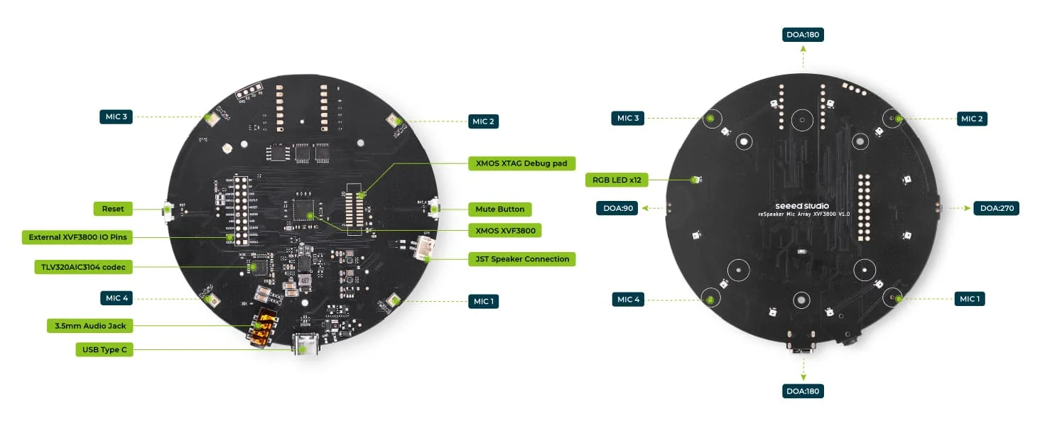 Un conjunto circular profesional de 4 micrófonos basado en XMOS XVF3800, que permite una captura clara de voz objetivo en entornos ruidosos.