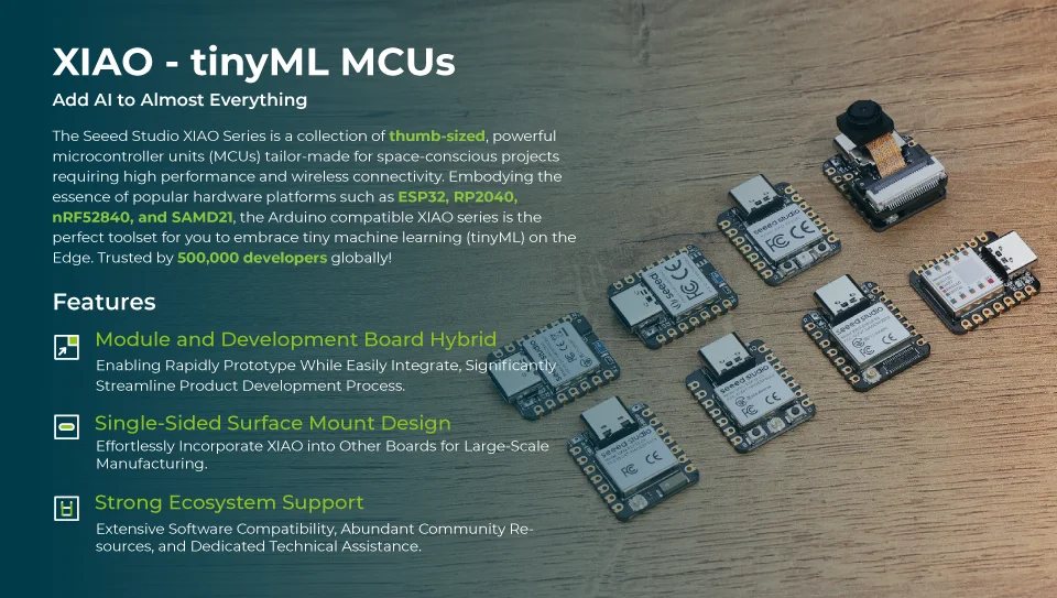 21x17,5mm, factor de forma clásico de la serie Seeed Studio XIAO, adecuado para dispositivos portátiles.