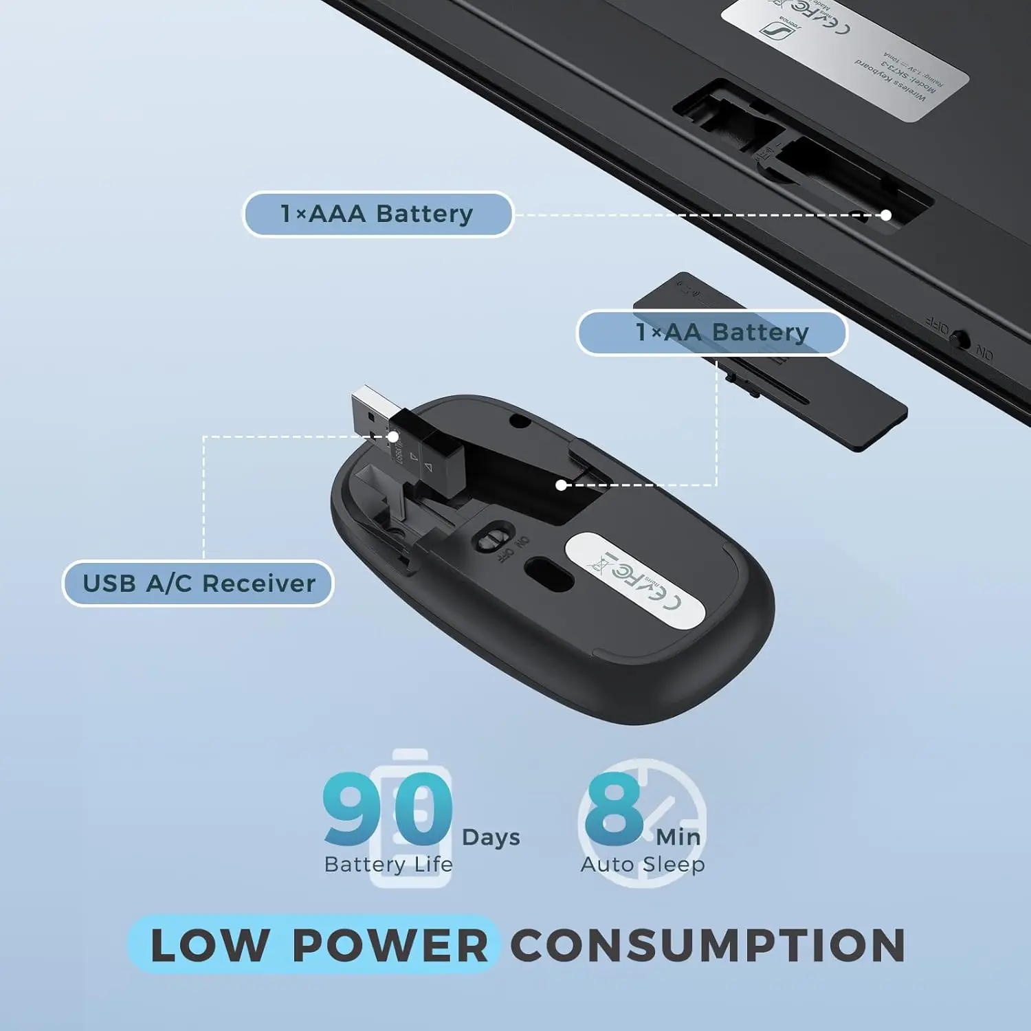 Bajo consumo de energía: el teclado funciona con una batería AAA, el mouse usa una batería AA, las baterías no están incluidas.Con modo de encendido/apagado y suspensión automática, este juego de teclado y mouse inalámbrico puede durar hasta 90 días en espera