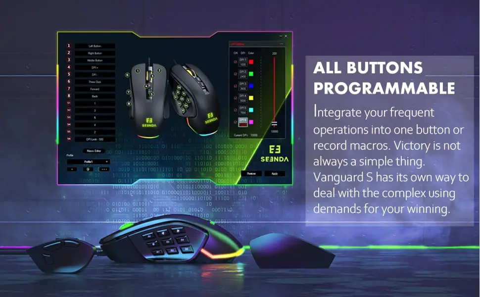 【DPI ajustable de 6 niveles】: Ratón profesional para juegos Seenda MMO con sensibilidad ajustable incorporada, niveles de 6 DPI, hasta 10000 DPI. Puede ajustar fácilmente la sensibilidad del ratón usando los botones del ratón. Cada vez que ajuste los DPI, el color RGB del ratón cambiará. 1000 Rojo-2400 Verde-3600 Azul-5000 Amarillo-7000 Cian-10000 Rosa. Y puede personalizar el valor DPI y el color a través del software.