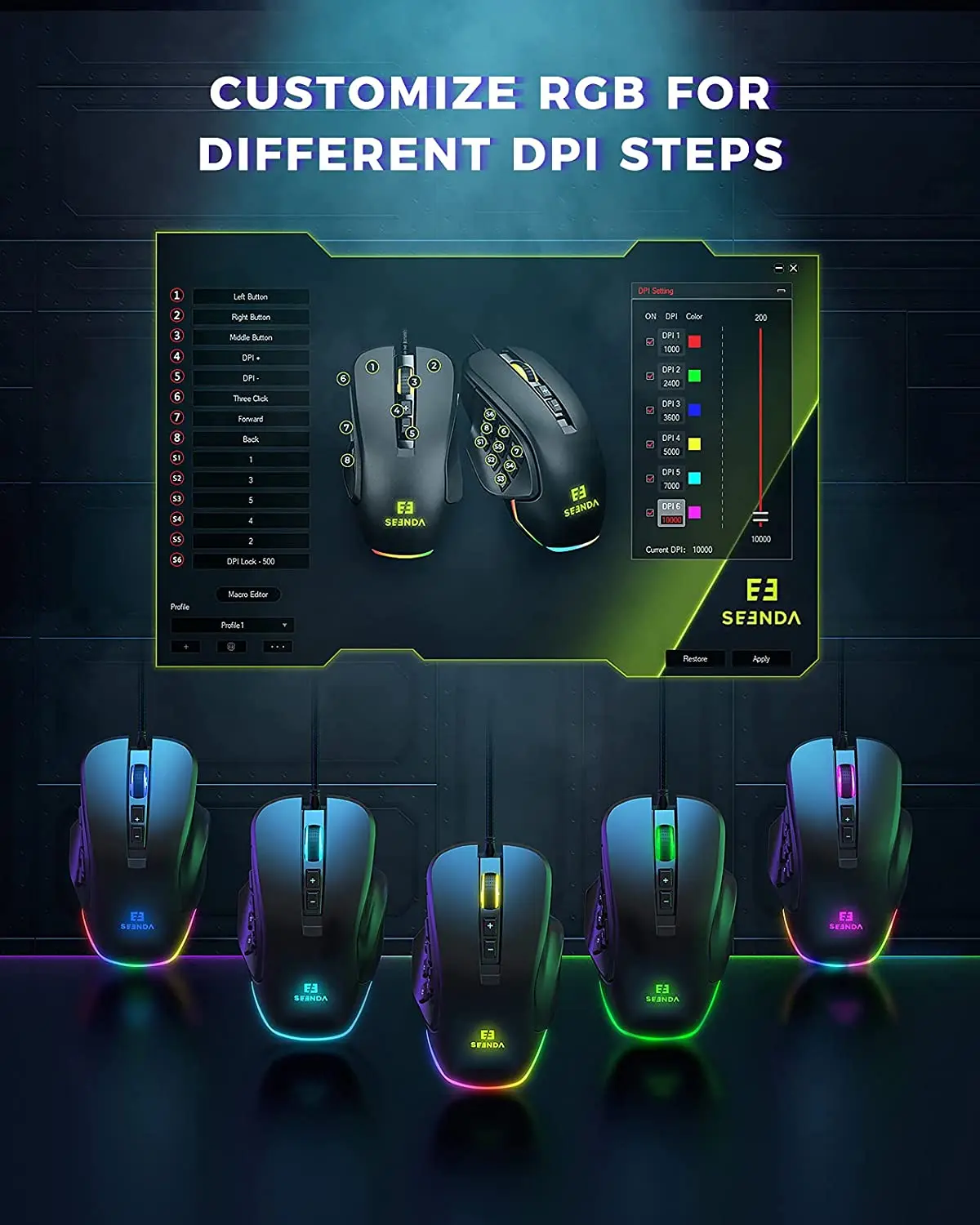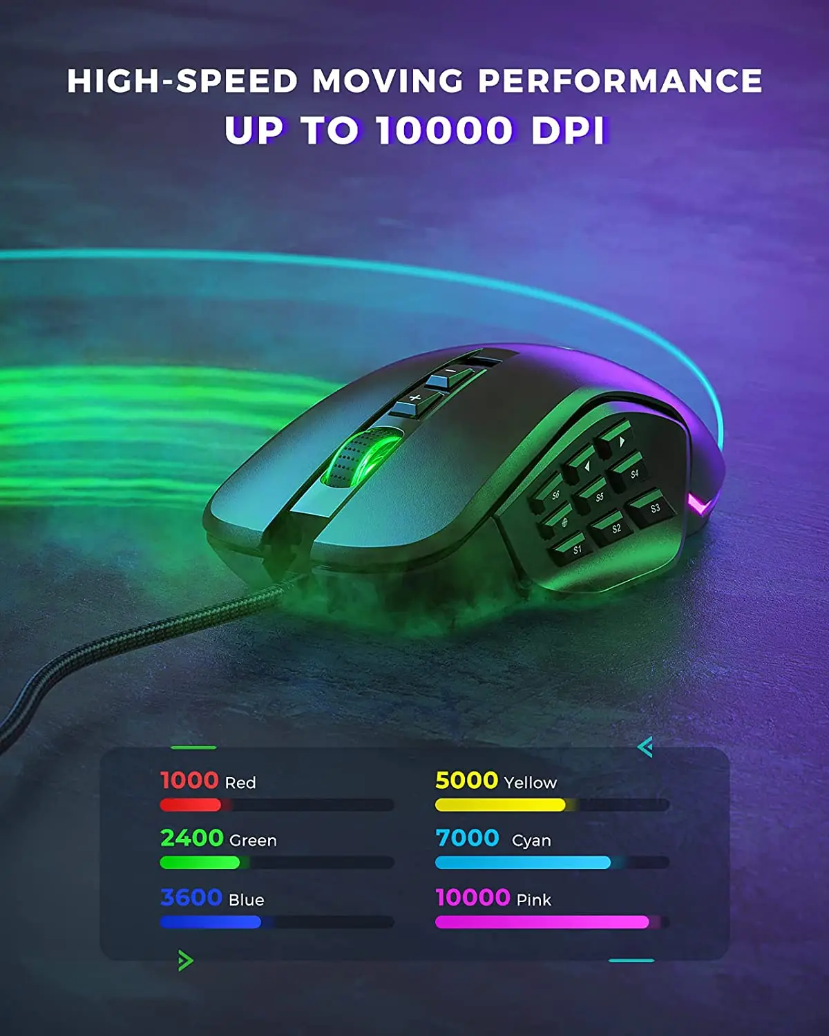 【DPI ajustable de 6 niveles】: Ratón profesional para juegos Seenda MMO con sensibilidad ajustable incorporada, niveles de 6 DPI, hasta 10000 DPI. Puede ajustar fácilmente la sensibilidad del ratón usando los botones del ratón. Cada vez que ajuste los DPI, el color RGB del ratón cambiará. 1000 Rojo-2400 Verde-3600 Azul-5000 Amarillo-7000 Cian-10000 Rosa. Y puede personalizar el valor DPI y el color a través del software.