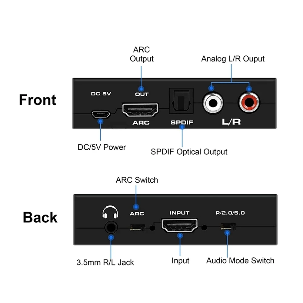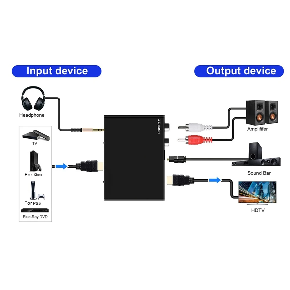 5. Wide compatibility. The HDMI-Compatible audio converter works perfectly with various HDMI-Compatible source devices, such as TVs, for PS3/4/5, Chromecast, Blu ray/DVD/HD players, cable/satellite set-top boxes, for Xbox, PC/laptops, high-definition cameras, high-definition DVRs, etc. Simply connect your device to enhance your home theater experience with high-resolution video and audio.