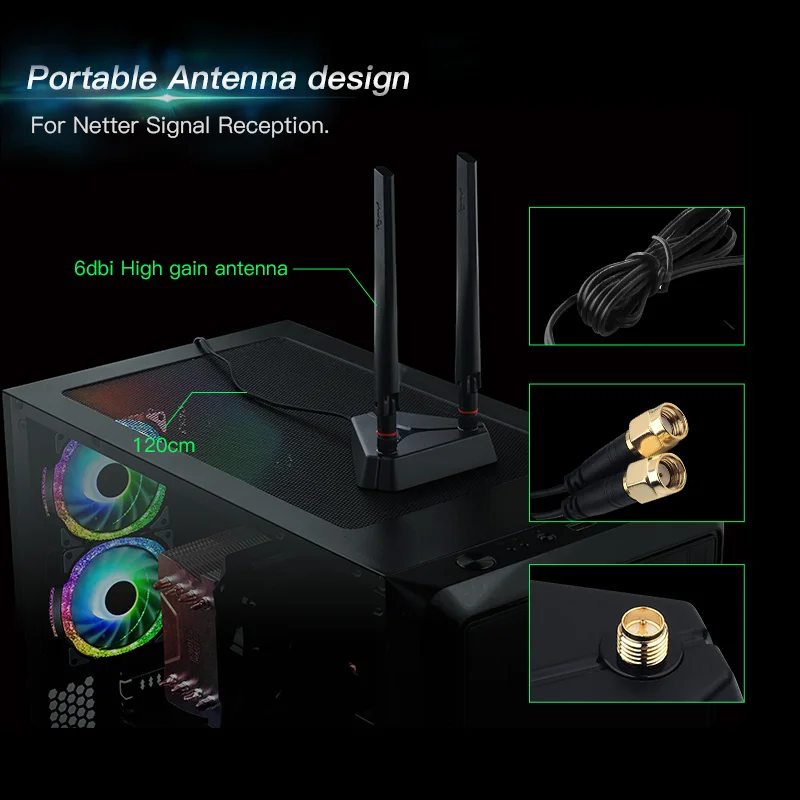 Como un adaptador wi-fi 6, ele suporta 802.11ax sobre 2x2 MU-MIMO antenas, e largura de banda máxima de 2,4 gbps, com suporte para bandas de 5 ghz e 2,4 ghz.