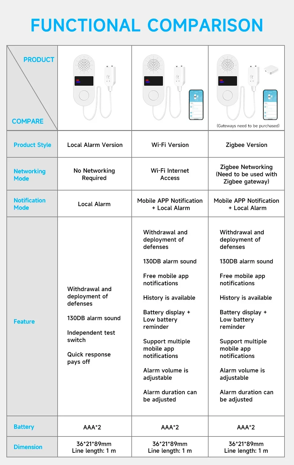 Cuando se detecta agua, este sensor emite una alarma perforante de 130 dB con luz LED intermitente, lo que garantiza conciencia inmediata y respuesta a posibles fugas.