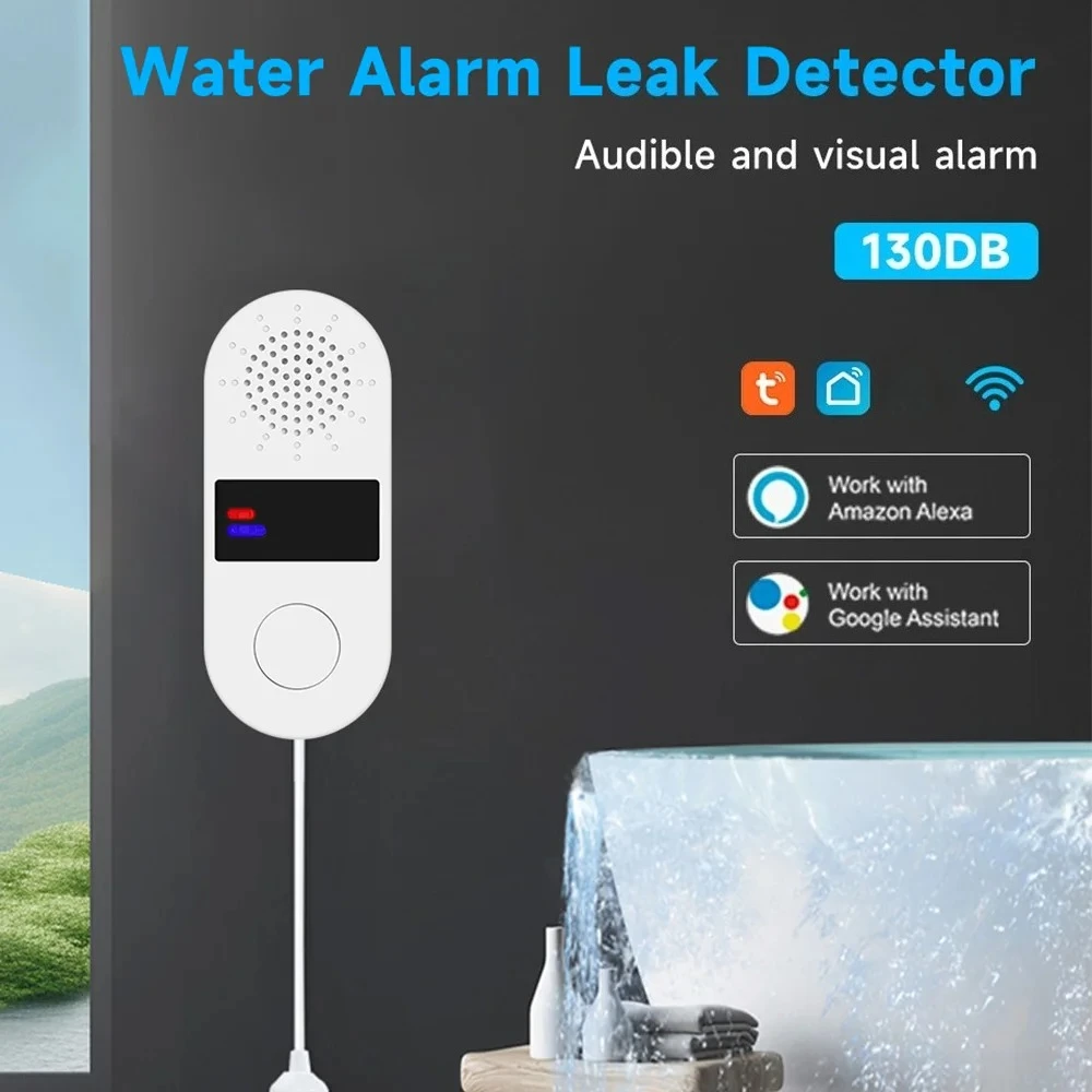 El más nuevo detector de fugas de agua 2.4GWifi con alarma de luz y sonido 130DB Tuya fugas de agua Sensor de alarma de agua inteligente para el hogar Control por aplicación