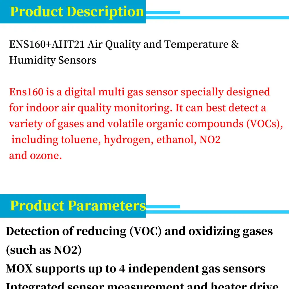 Ens160 es un sensor multigas digital especialmente diseñado para el monitoreo de la calidad del aire interior. Puede detectar mejor una variedad de gases y compuestos orgánicos volátiles (COV), incluyendo tolueno, hidrógeno, etanol, NO2 y ozono. El sensor de calidad del aire se utiliza para la automatización del hogar y la construcción, bienes de consumo, aparatos eléctricos y purificación de aire
