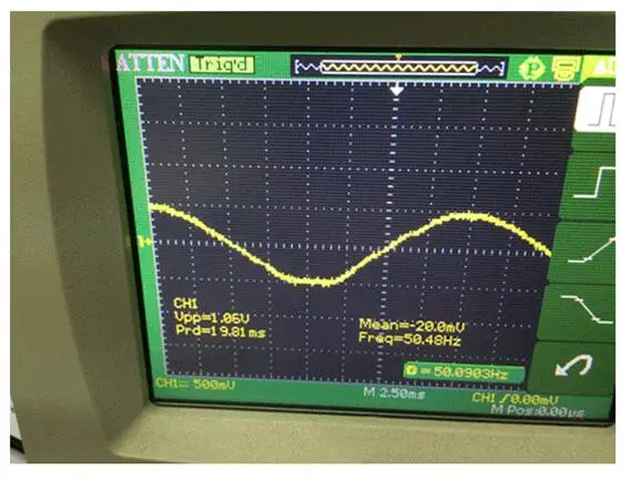 Instrucciones:Durante la medición, el conductor de señal a probar pasa a través del orificio del transformador, VCC y GND están conectados a la fuente de alimentación de 5 a 30 V CC, VOUT y GND están conectados al osciloscopio y el potenciómetro se ajusta para obtener la forma de onda que desea..La amplitud de la forma de onda seguirá. La corriente medida aumenta y aumenta, pero el máximo no supera los 1/2 VCC.La siguiente figura muestra la forma de onda medida cuando VCC está conectado a una fuente de alimentación de 5 V y uno de los soldadores de 60 W pasa a través del orificio redondo del transformador: