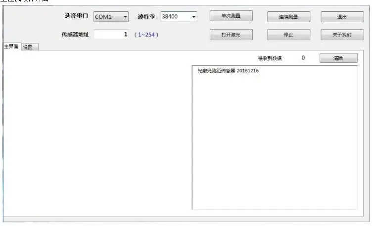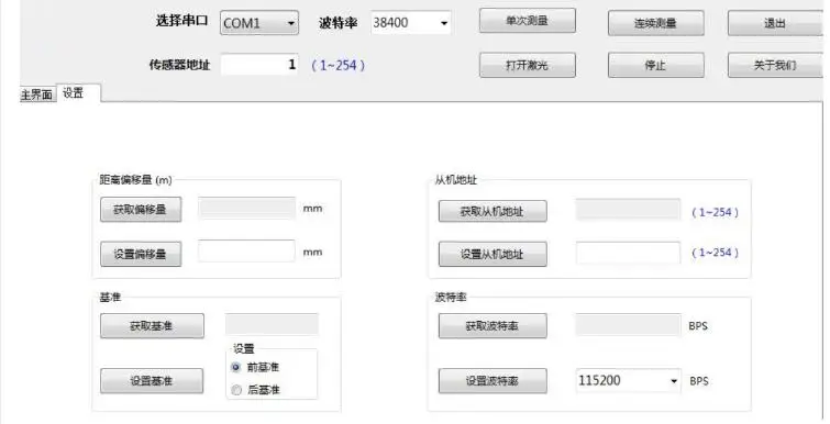 1. First make sure that the machine is powered normally, and then the serial communication is normal, select the corresponding COM port, enter the address of the current machine in the "Sensor Address" column (the default is 1), and then select the corresponding baud rate (the default is 115200, users can change according to their needs during use);2. Click the single measurement button, the laser will flash once, and the distance information currently measured will be displayed in the blank area on the right side of the software.3. Click continuous measurement, the laser will flash continuously, and then the measured distance data will be output on the right display area.4. Click to turn on the laser. The laser will stay on, but will not measure distance. Users can use this function to aim at the measured object.5. Click the setting button to enter the following interface, which is mainly used to configure some parameters of the machine;