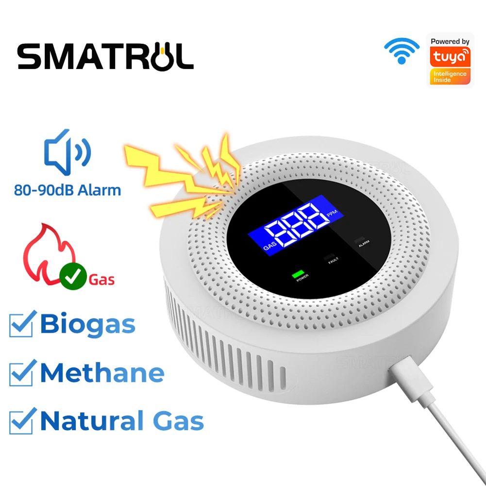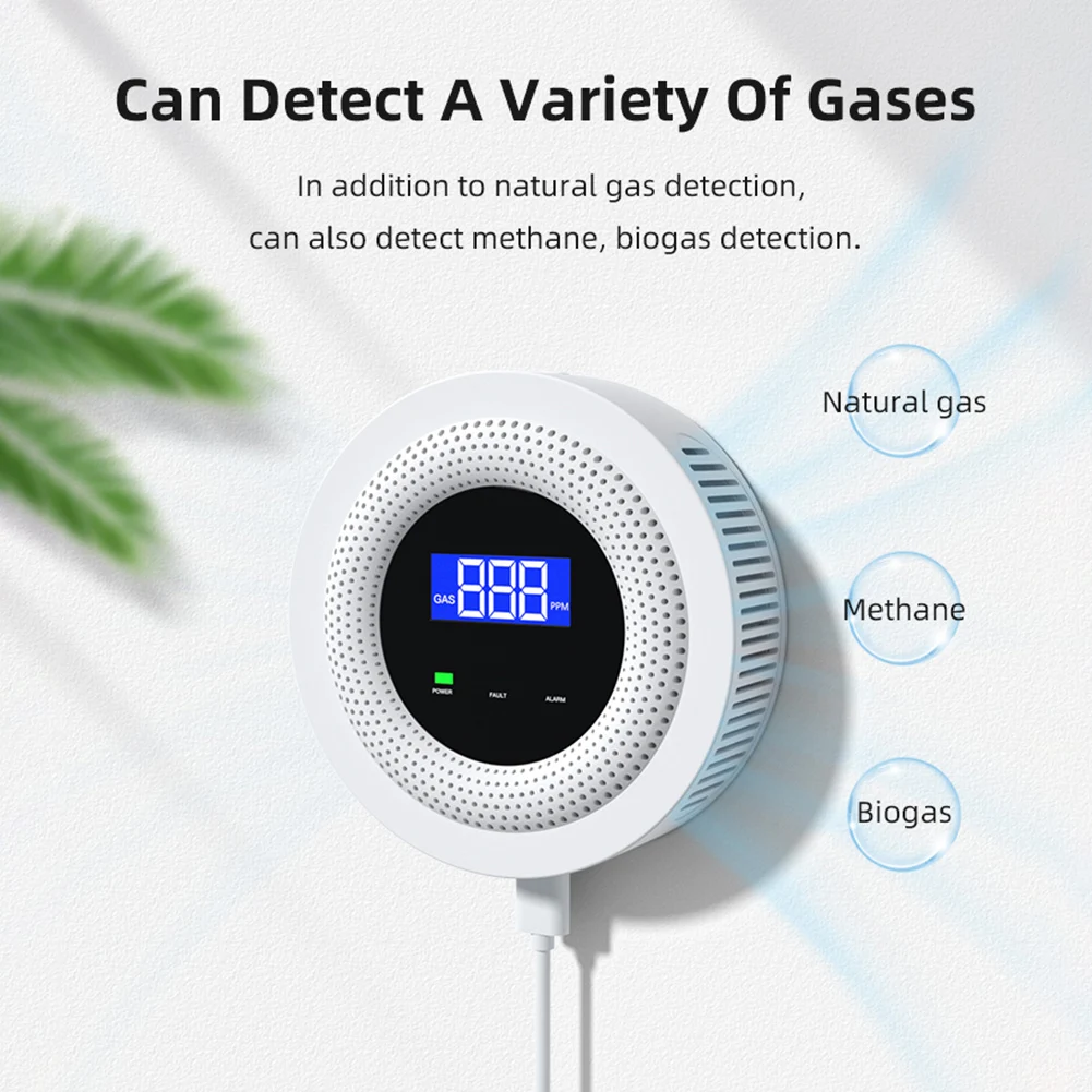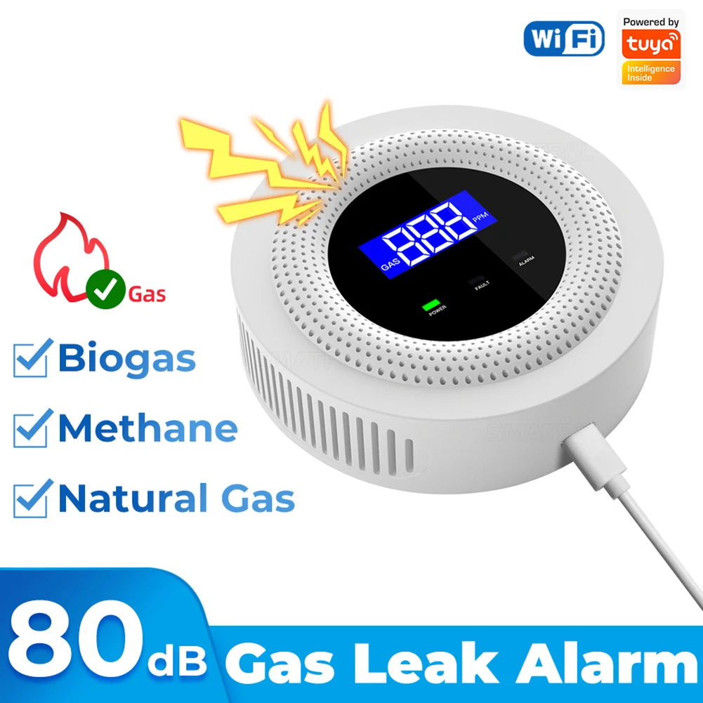 Comprar Sensor de fugas de Gas Tuya, alarma de hogar con pantalla Digital, USB tipo C, aplicación de alimentación, Control remoto, Detector WiFi para Gas Natural, biogás, metano