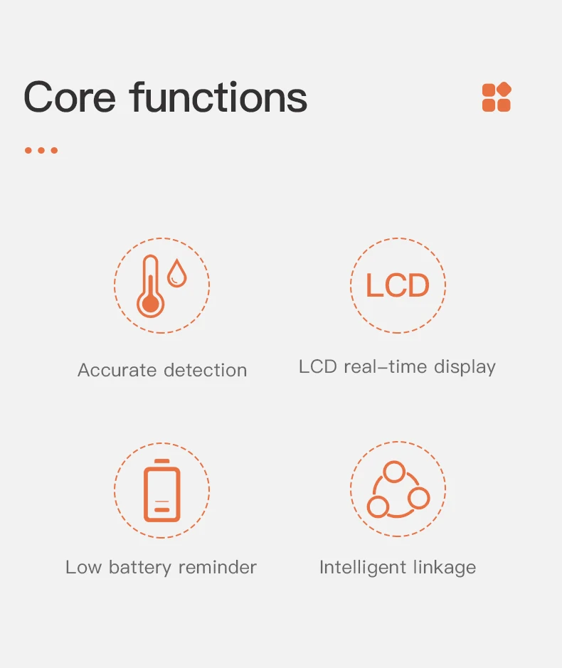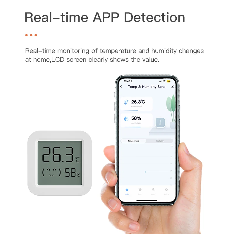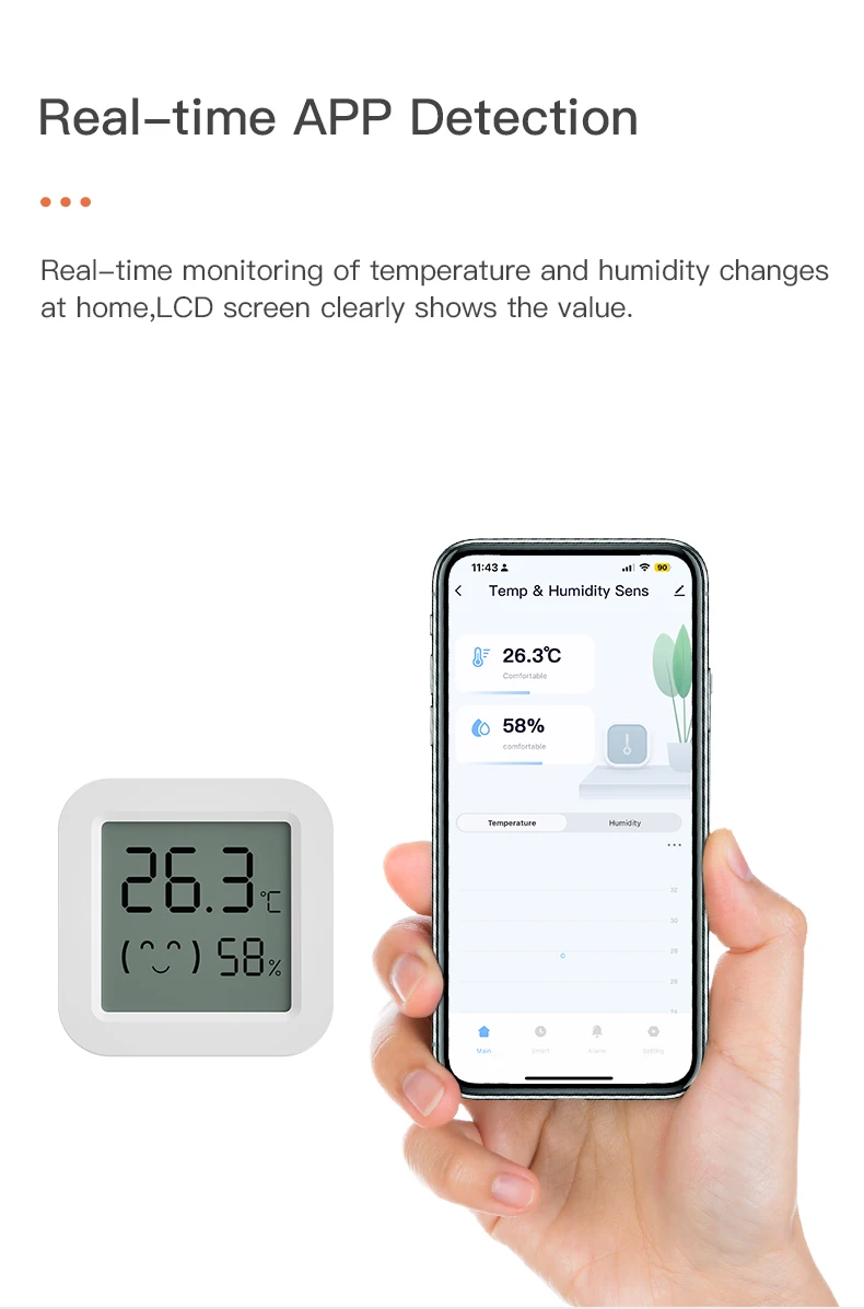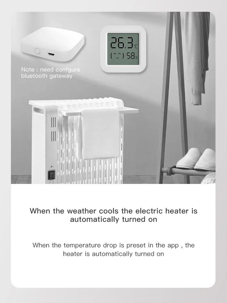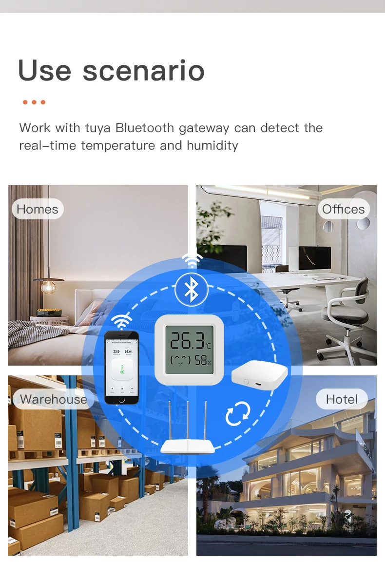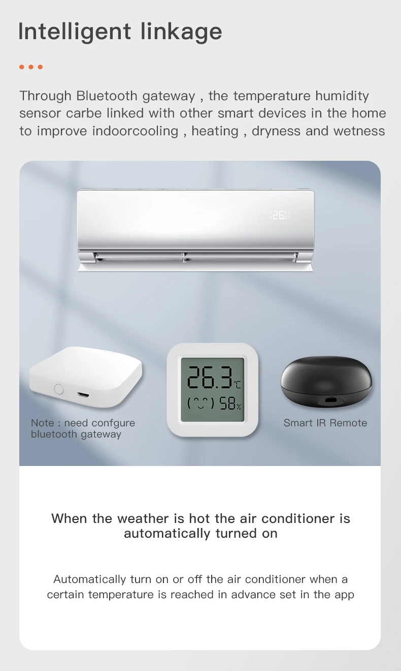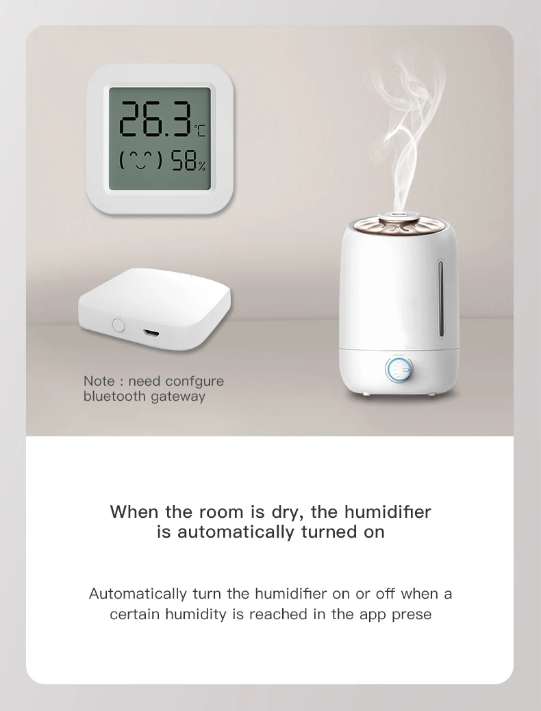 -A través de la puerta de enlace, el sensor de temperatura y humedad se conecta con otros dispositivos inteligentes en el hogar para mejorar el enfriamiento, la calefacción, la sequedad y la humedad en interiores.