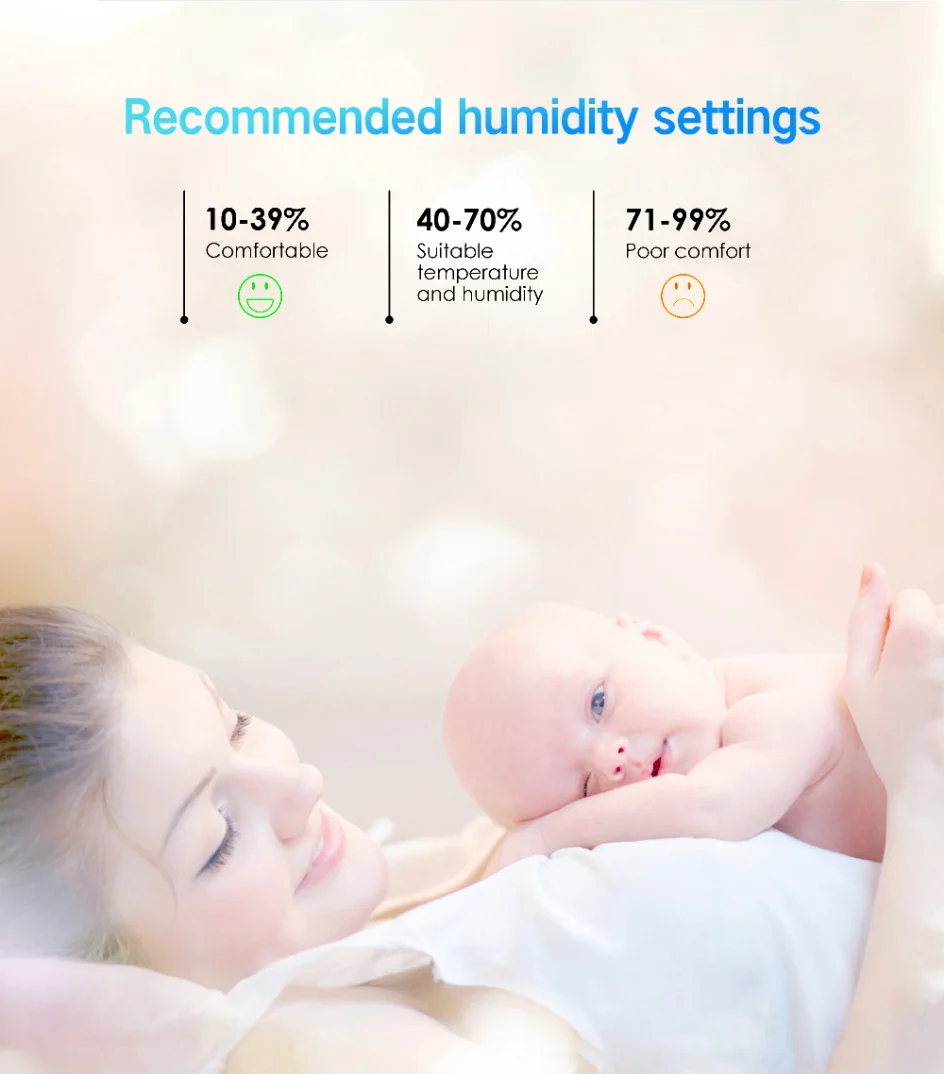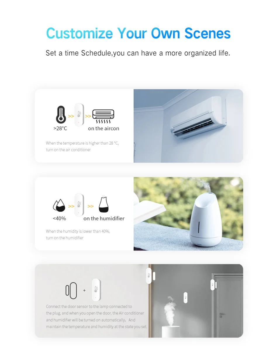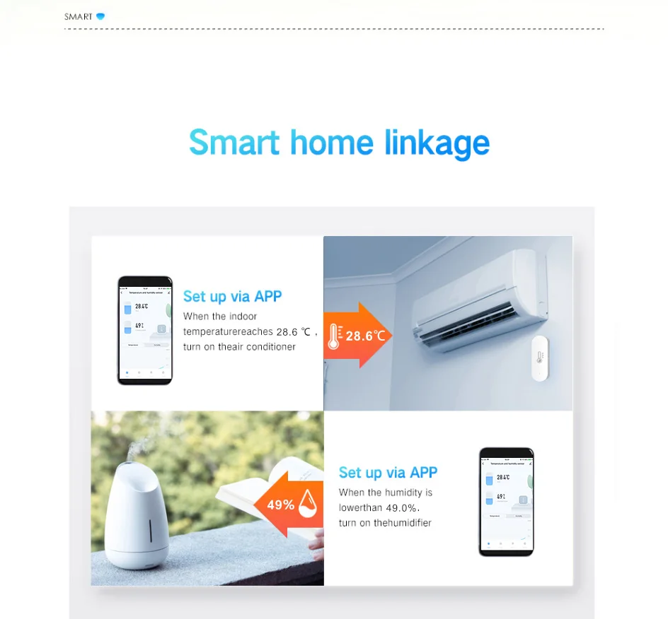 【Enlace inteligente】 Cuando el ambiente cambia, puede hacer ntelligent vinculación. Por ejemplo, el acondicionador de aire se encenderá y girará a la temperatura especificada automáticamente cuando la temperatura ambiente supere 28 ℃. Y el humidificador rociará cuando la humedad sea inferior al 20% RH.