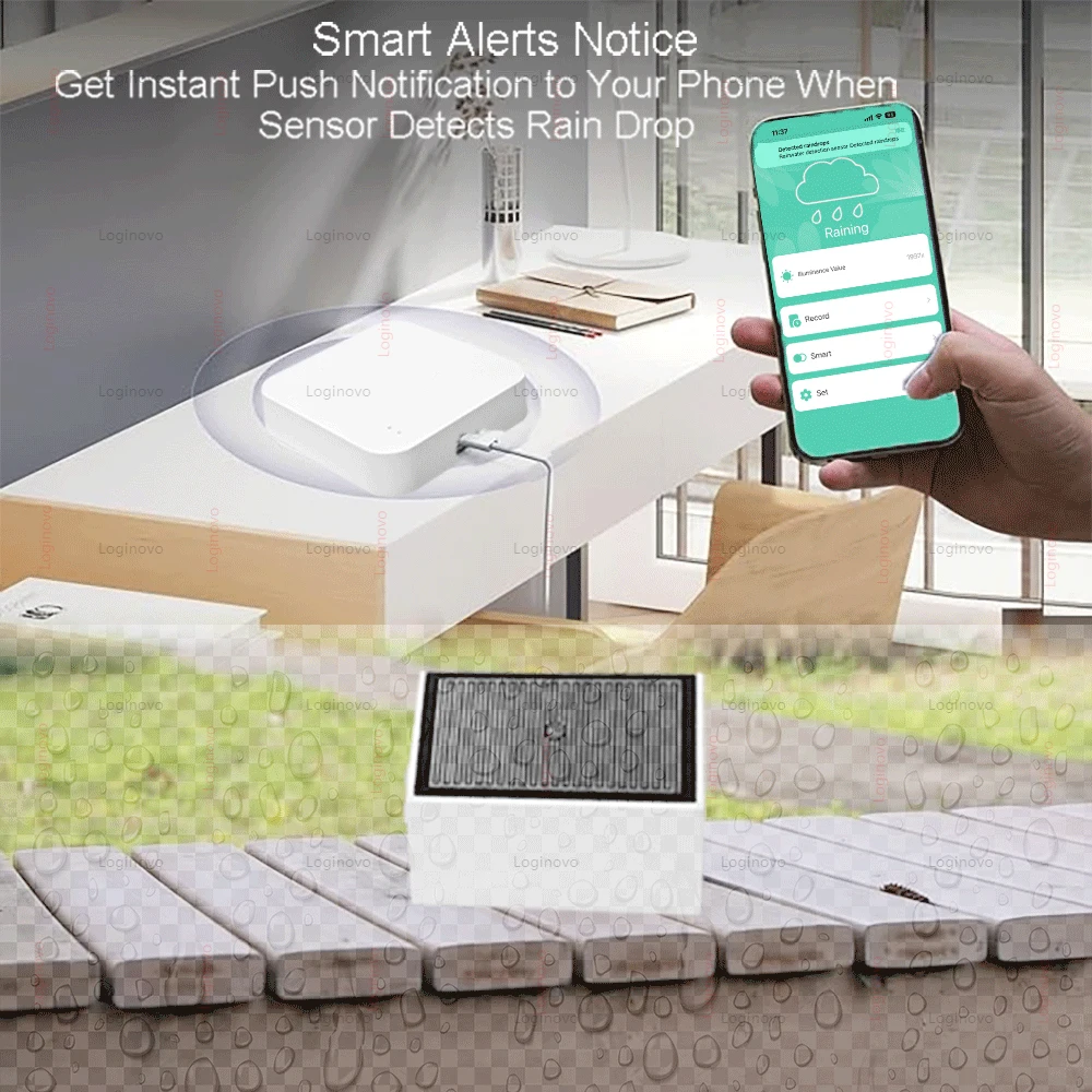 (5) 【Función de alerta de emergencia】 Una vez que el sensor de vibración detecta lluvia, enviará notificaciones de alerta directamente a su teléfono.De esta manera, podrá mantenerse informado sobre lo que sucede sobre su ciudad natal, incluso cuando no esté allí.