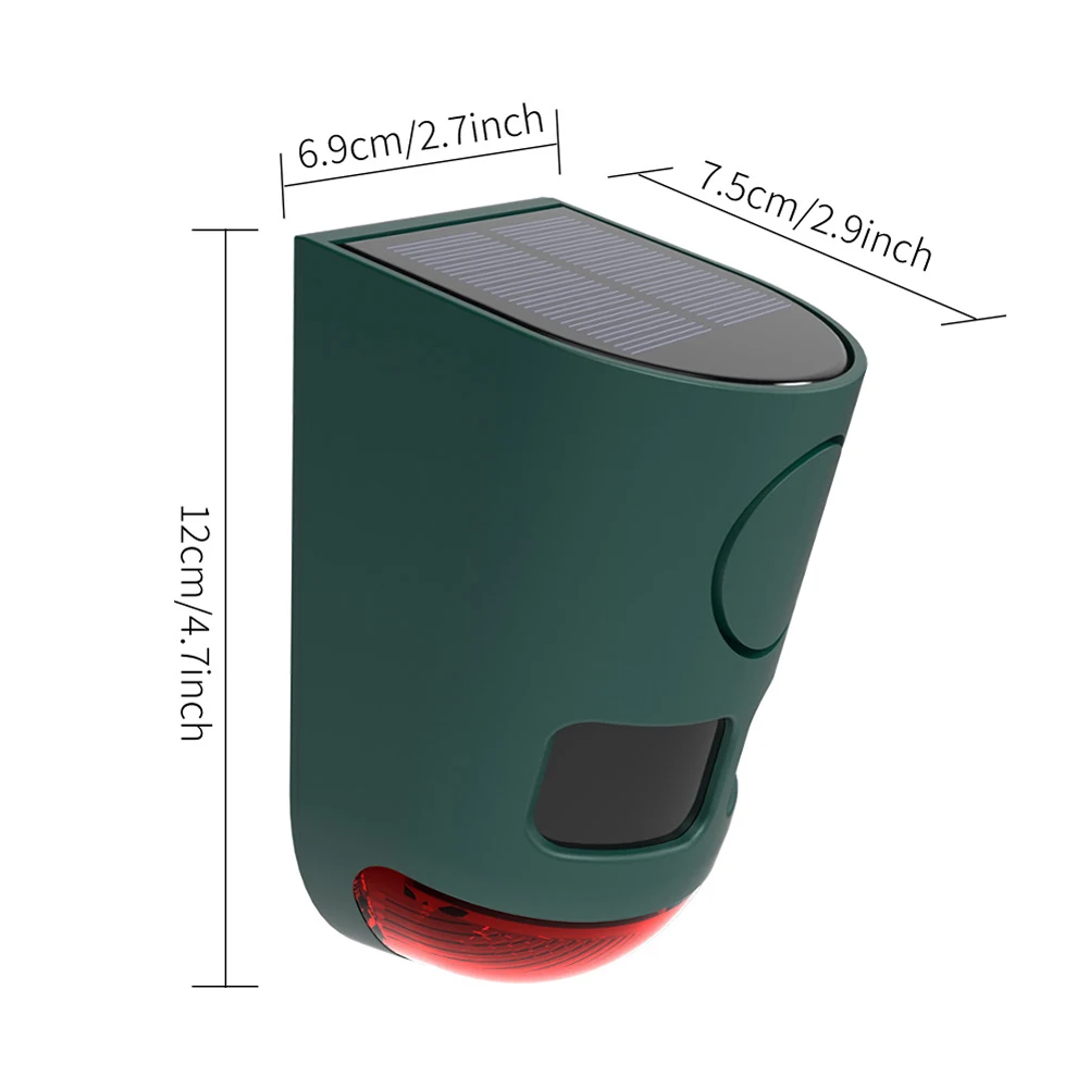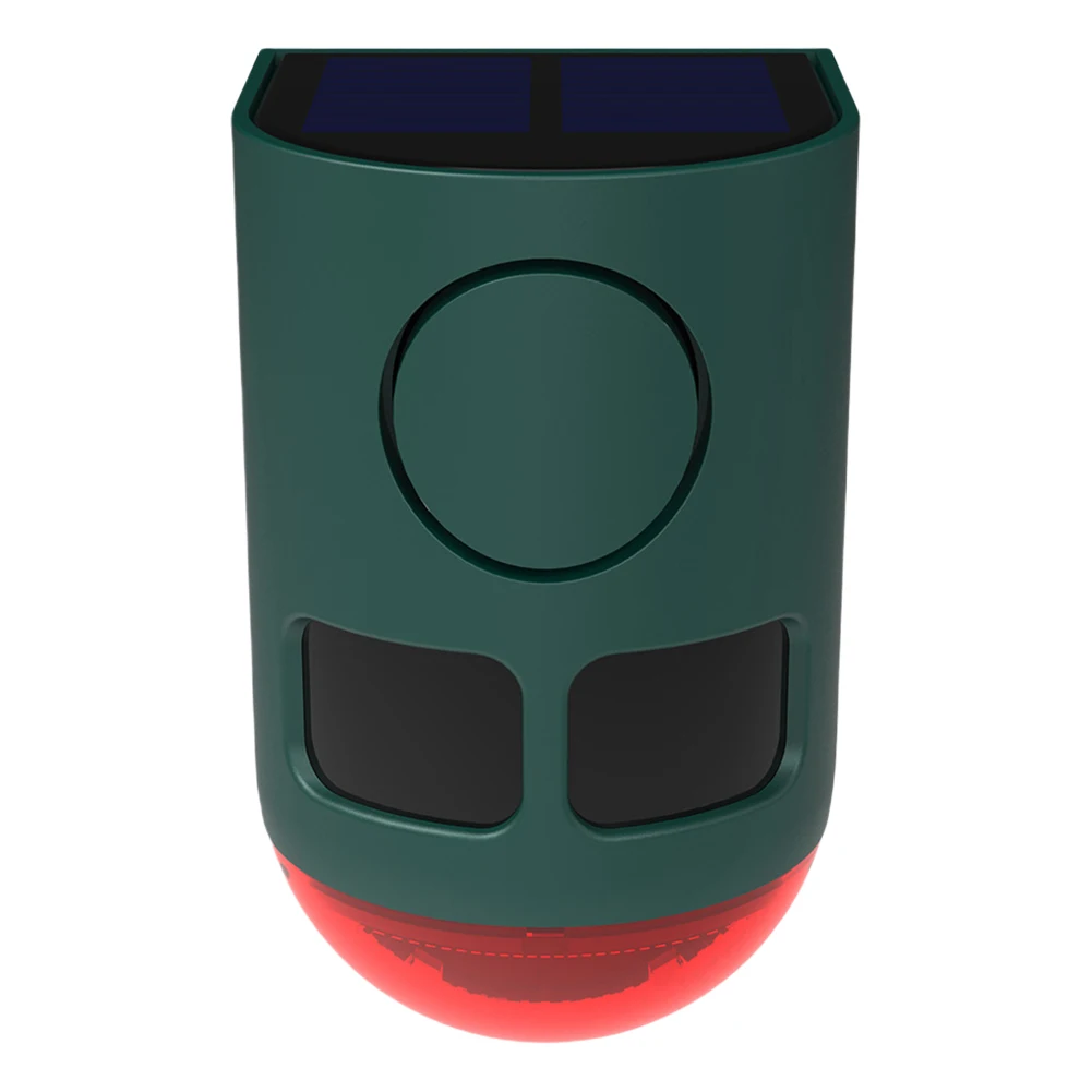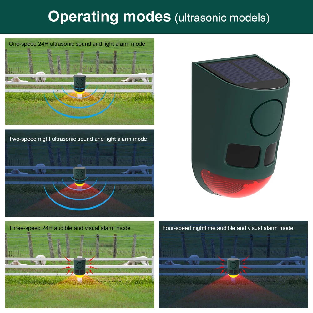 : El modo A ofrece alarmas luminosas y sonoras ultrasónicas las 24 horas; El modo B se activa solo por la noche; El modo C es un modo continuo de alarma de luz y sonido; mientras que el Modo D funciona solo durante la noche.3. Opciones de energía confiables:Utilice energía solar para uso sostenible en exteriores o cambie a carga USB para alarma de seguridad del hogar durante condiciones nubladas prolongadas o escenarios interiores.Con clasificación de impermeabilidad IP55, resiste perfectamente el clima lluvioso.