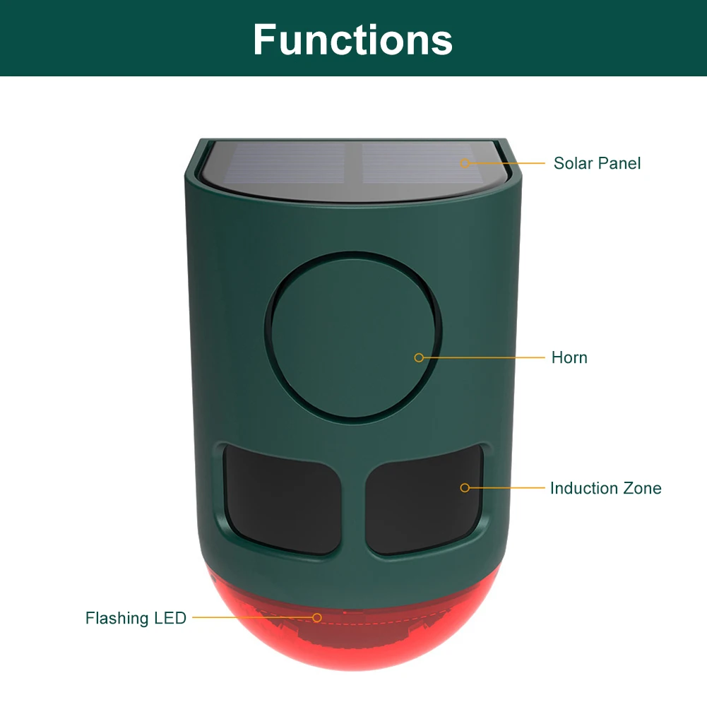 Características:1.Alarma de sensor de movimiento solar para exteriores:Con sensores infrarrojos combinados con luces ultrasónicas, sonoras y intermitentes, esta alarma versátil disuade múltiples tipos de animales de manera efectiva.Mantenga sus espacios al aire libre protegidos y libres de animales.