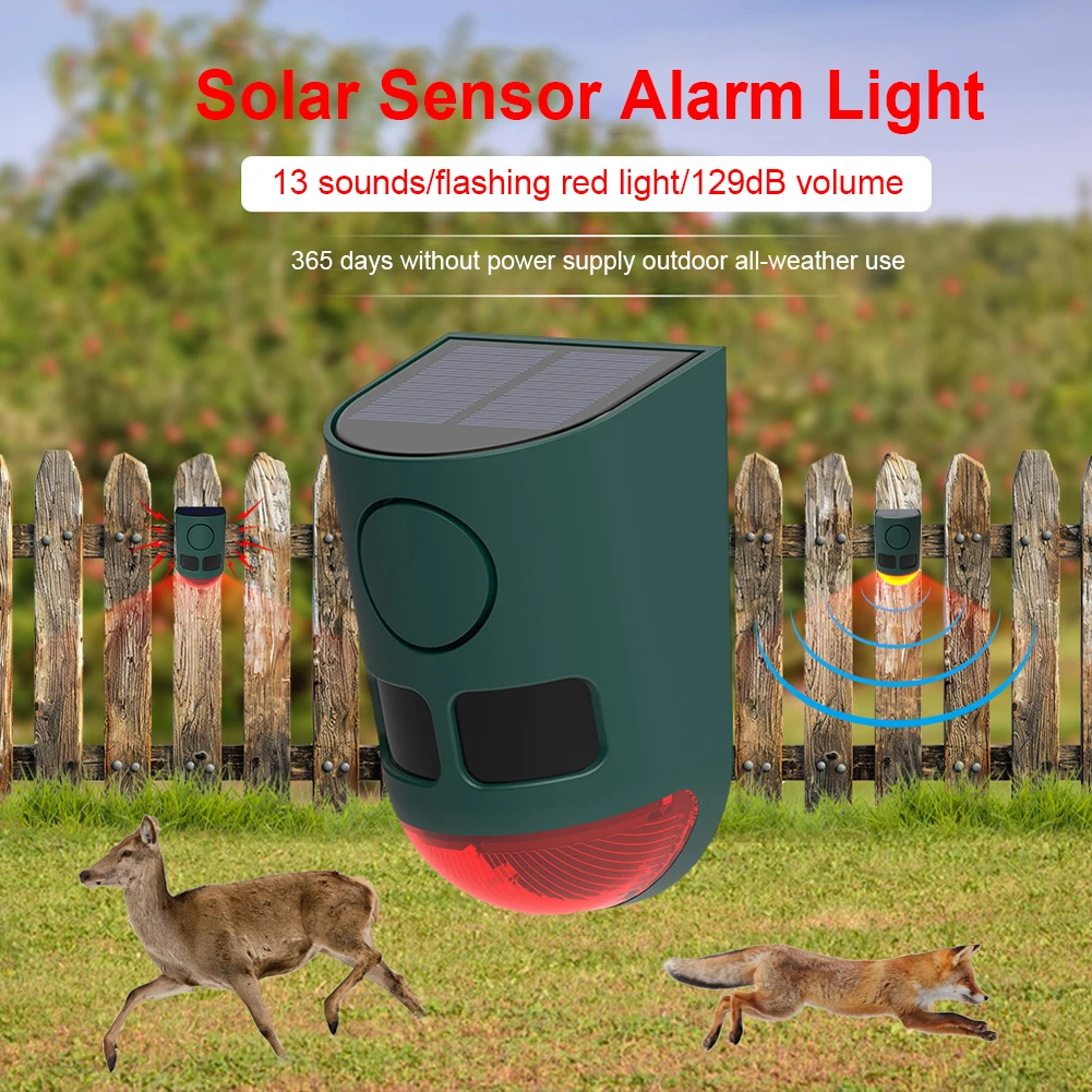 Alarma con sensor de movimiento infrarrojo solar, alarma de seguridad para el hogar con luz intermitente, repelente de animales, generador de ruido de sonido fuerte de 129dB para disuadir la mapache, ciervo, salchicha, Coyote para patio, granja, jardín