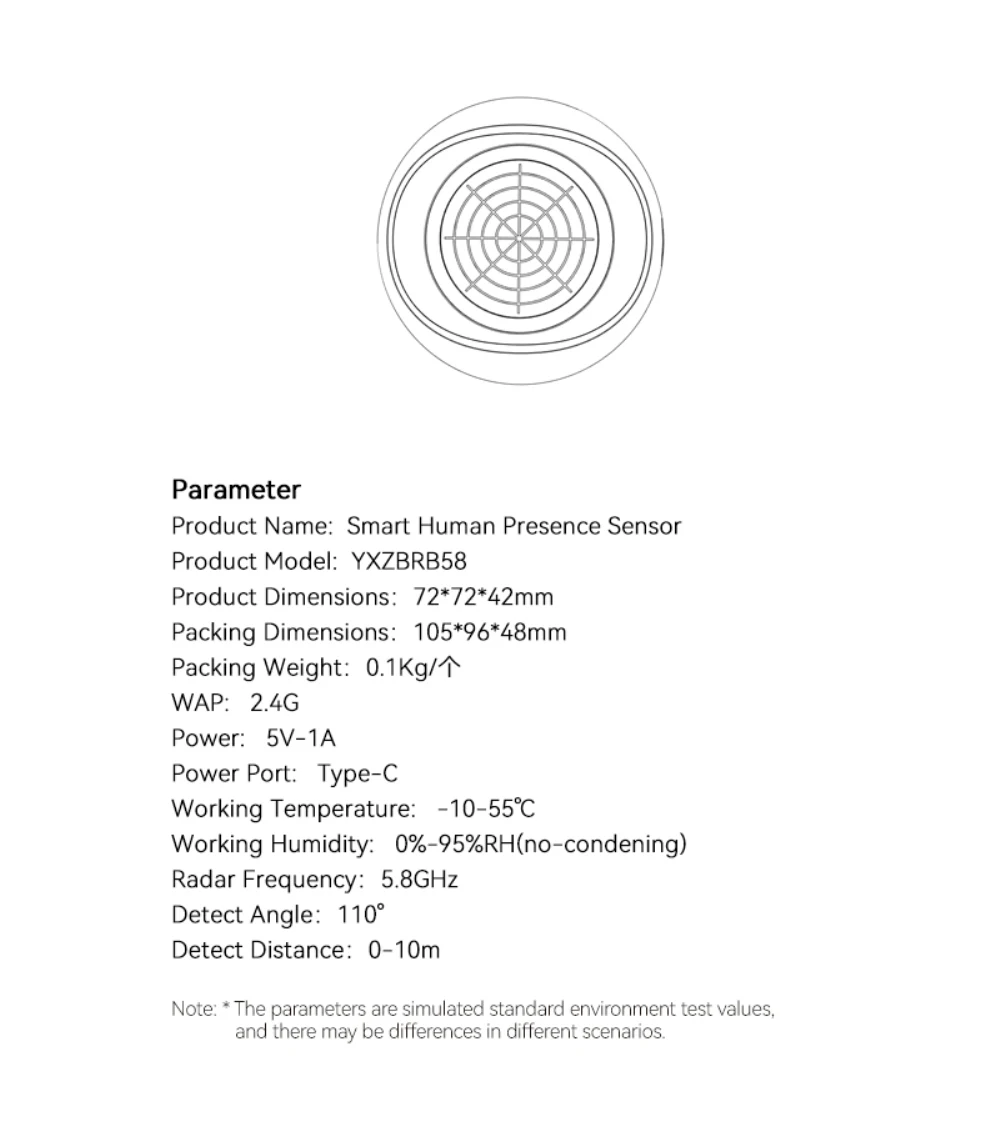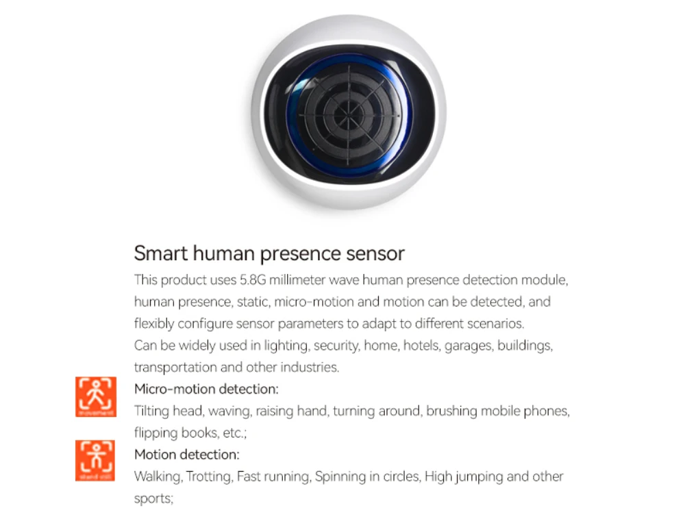 Presencia humana estática Este producto utiliza tecnología avanzada de radar de onda milimétrica de 5,8 GHz para detectar con precisión si hay personas en el área, ya sean en movimiento o estacionarias.