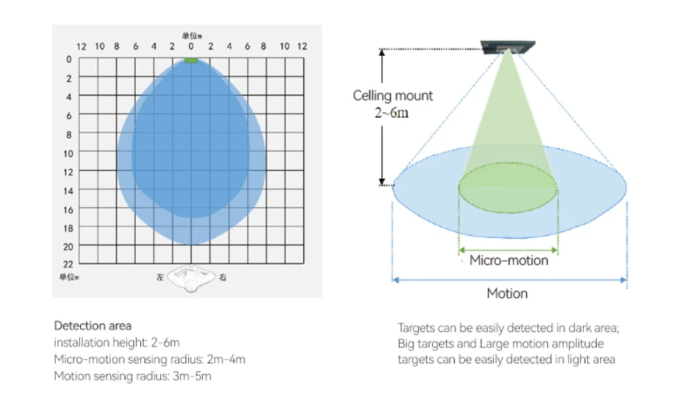 Rango de detección cónico con un ángulo de detección de 110 grados El radio de detección de micromovimiento humano es de aproximadamente 2m, el radio de detección de movimiento es de 5m (la altura de instalación es de 2-6m, proyección del suelo).