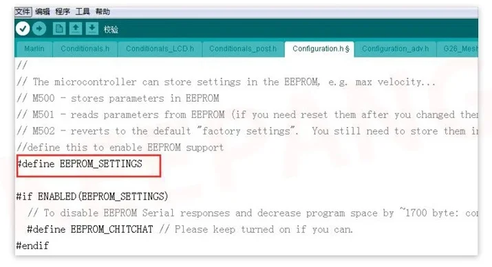 1) Retire el // delante de#definir EEPROM_ CONFIGURAZIONES, encender M500 para guardar datos