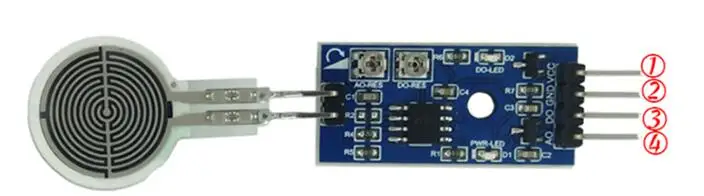 VCC: positive supply voltage (5V)GND: negative supply voltageDO: High point level signal outputAO: analog voltage signal output (0-3.3V)AO-RES: magnification adjustment potentiometerDO-RES: comparison threshold adjustment potentiometerInstructions for use:Gasket installationPlace the green surface of the gasket on the sensor, in the center of the sensor sensing area, and then apply the tested object vertically to the gasket, so that the effective contact and force of the sensor and the tested object all act on the sensor sensing area.Precautions when installing and using the sensor1. Try to choose a stable, smooth and flat installation surface;When your mounting surface is curved, you must bend it when you install the sensor, so that-the sensor sensing area will be stressed, which will affect the accuracy of the sensor to a certain extent, so be careful not to make the sensor effective The surface is installed on a curved surface with a large curvature (Note: the round effective surface cannot be bent, and the long tail can be bent);2. It is recommended to use a flexible gasket with a relatively stable elasticity between the sensor and the measured object to ensure effective contact between the sensor and the measured object;3. Keep the contact surface of the sensing area clean;4. The force should not exceed its rated range;5. Try not to solder it directly to the universal board or the circuit board without the specific package belonging to it, so as to avoid the thermal deformation of the tail and poor contact. The metal terminal of the sensor can be connected to the wire by fast welding.