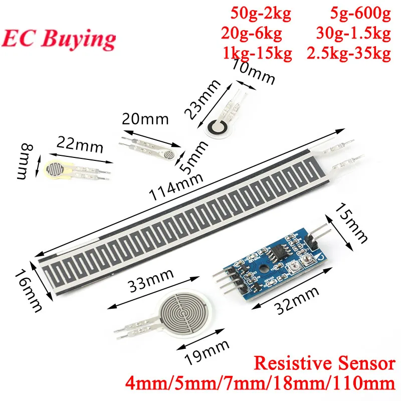 Load Cell Resistive Membrane Pressure Sensor Module Flexible Force Sensitive Analog FSR402 4mm 5mm 7mm 110mm For ArduinoProduct parameters:The greater the pressure, the lower the resistance4mm small range: 50g-2kg4mm mid-range: 1kg-15kg4mm large range: 2.5kg-35kg5mm: 5g-600g7mm: 30g-1.5kg18mm: 20g-6kg110mm: 20g-≥10kgPin description: