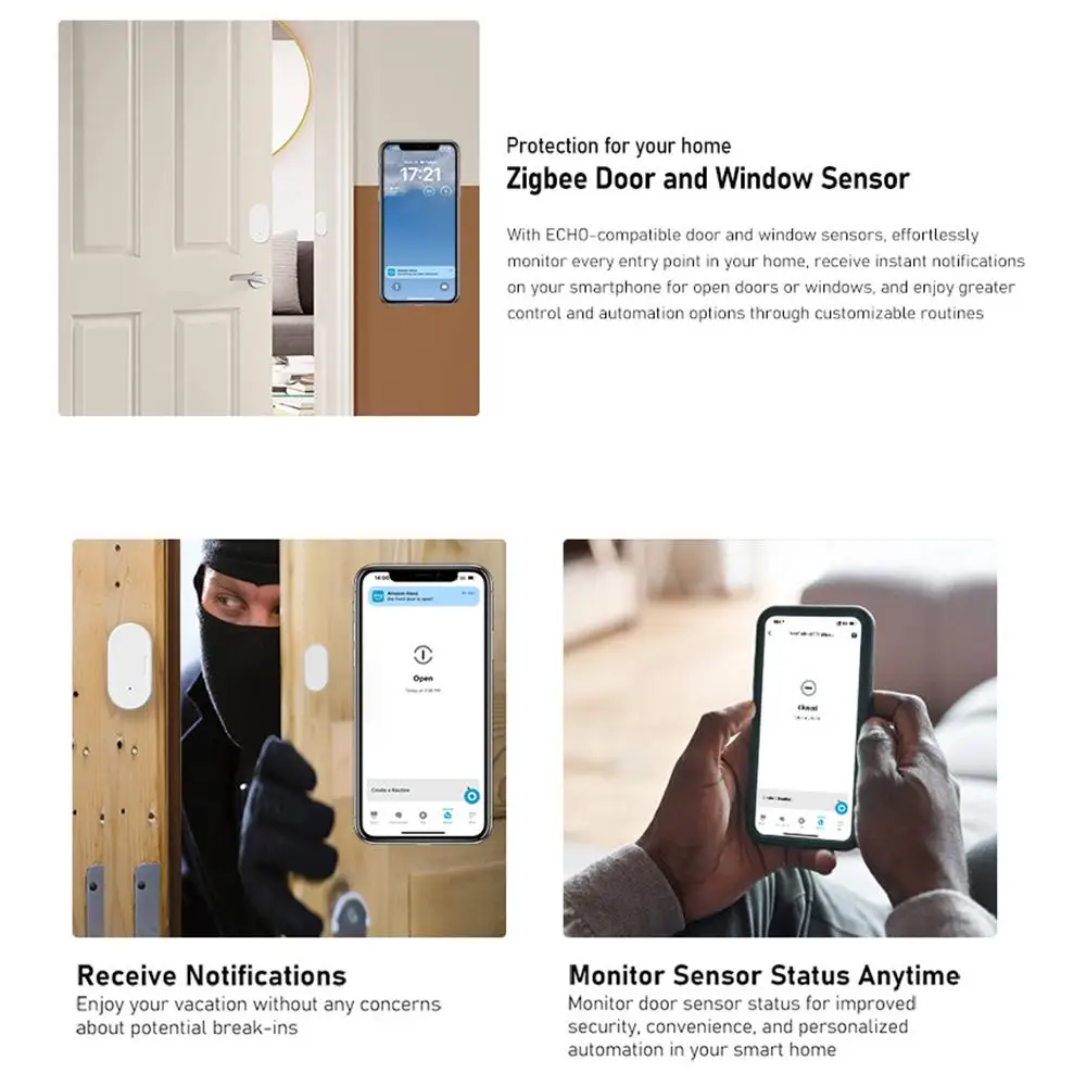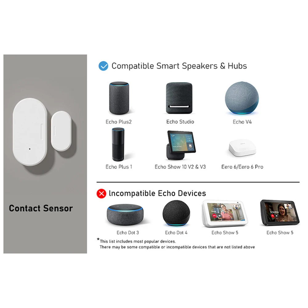 Automatización inteligente del hogar: los sensores de puertas y ventanas pueden controlar automáticamente otros accesorios compatibles a través de programas diarios, como asistentes domésticos, Hubitat o dispositivos Alexa Echo, incluido Echo 4th generación, echo Plus de 1ª y 2ª generación, Echo Show 10 De 2ª y 3ª generación, Echo Studio, Eero 6 y Eero Pro6.