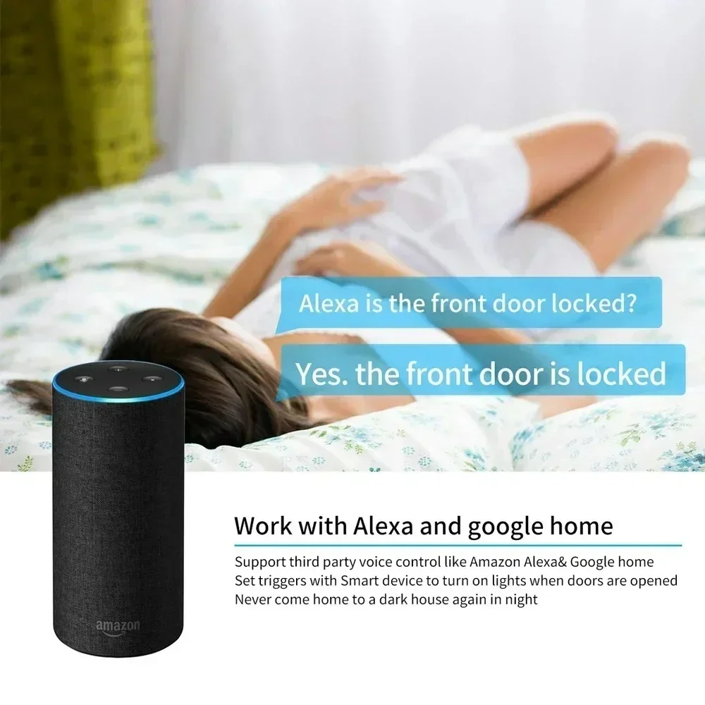 Simplemente use su voz para controlar los dispositivos conectados mediante Alexa o Google Home.También puede realizar control automático junto con otros dispositivos inteligentes que sean compatibles con Smart Life.Conveniente para que pueda detectar sus puertas, ventanas, gabinetes, cajones o cualquier lugar donde desee recibir una notificación cuando se abre o cierra.