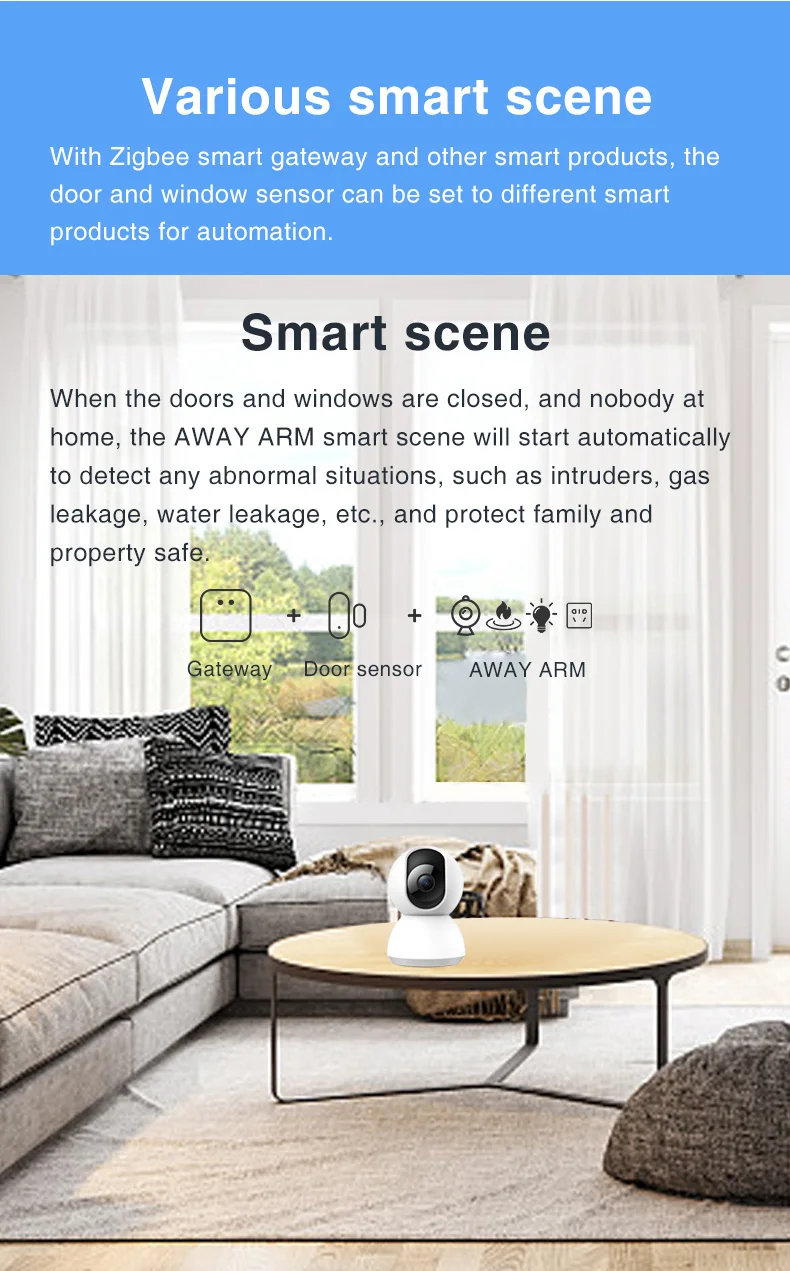 Con la puerta de enlace inteligente Zigbee y otros productos inteligentes, el sensor de puertas y ventanas se puede configurar en diferentes productos inteligentes para la automatización.