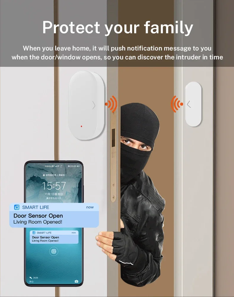 Envíe una notificación instantánea a su teléfono inmediatamente cuando se abra o cierre una puerta o ventana.Mantenerte informado todo el tiempo.