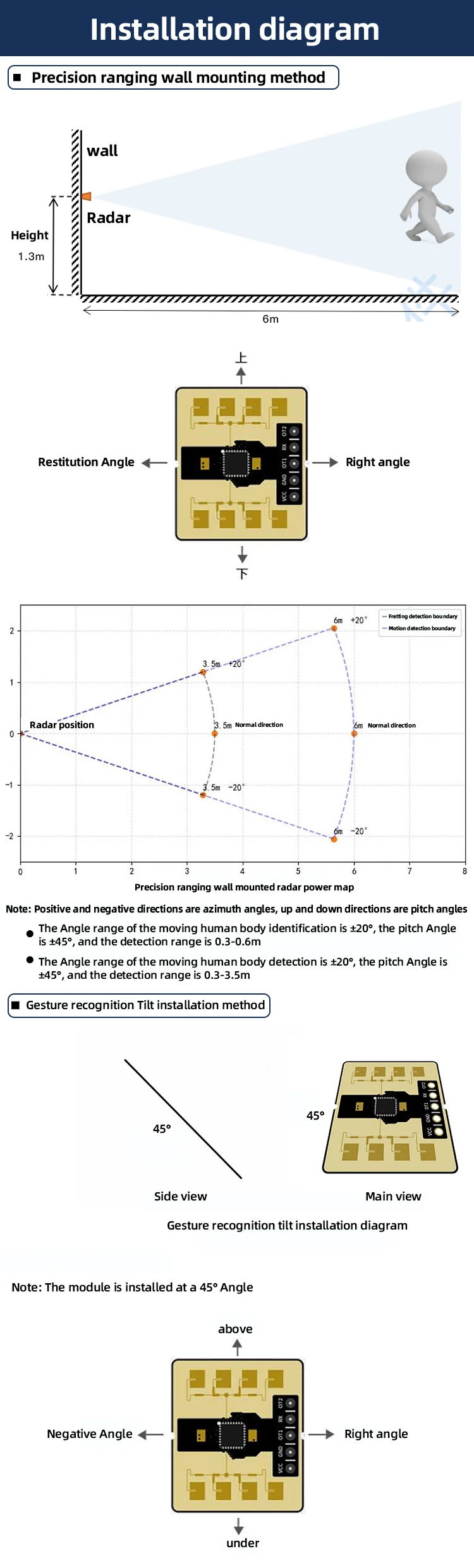 Aviso:1. Las direcciones positiva y negativa son ángulos de azimut y las direcciones arriba y abajo son ángulos enteros. 2. Ángulo de azimut del rango de detección de rango preciso ±20 ° , ángulo de paso ±45 ° 3. El rango angular de reconocimiento del cuerpo humano en movimiento es el ángulo de dirección ±20 ° , ángulo de paso ±45 ° y el rango de detección es de 0,3 m ~ 6 m. 4. El rango angular de detección del cuerpo humano de micromovimiento es el ángulo de dirección ±20 ° , ángulo de paso ±45 ° y el rango de detección es de 0,3 m ~ 3,5 m. 5. El rango de detección de reconocimiento de movimiento tiene un ángulo de dirección de ±20 ° , un ángulo de inclinación de ±40 ° y un rango de distancia de detección de 0,3 ~ 2,2 m en un área sectorial. 6. Reconocimiento de gestos y ángulo de dirección del rango de examen corporal de micromovimiento ±30 ° , ángulo de paso ±40 ° , rango de distancia de detección Área del sector de 0,5 ~ 1 m