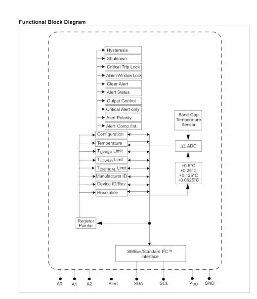Feature:. Accuracy:- ± 0.25 (typical) from -40 ° C to +125 ° C- ±0.5 °C (maximum) from -20 ° C to 100 ° C±1°C (maximum) in the range of 40°C to +125°C. User selectable measurement resolution:-+0.5°C, +0.25°C, +0.125°C, +0.0625°C. User programmable temperature limit:- temperature window limit. User programmable temperature alarm output . Operating voltage range: 2.7V to 5.5V . Working current: 200μA (typical). Shutdown current: 0.1 microamperes (typical). Available packaging: 2x3 DFN-8, MSOP-8Typical Application