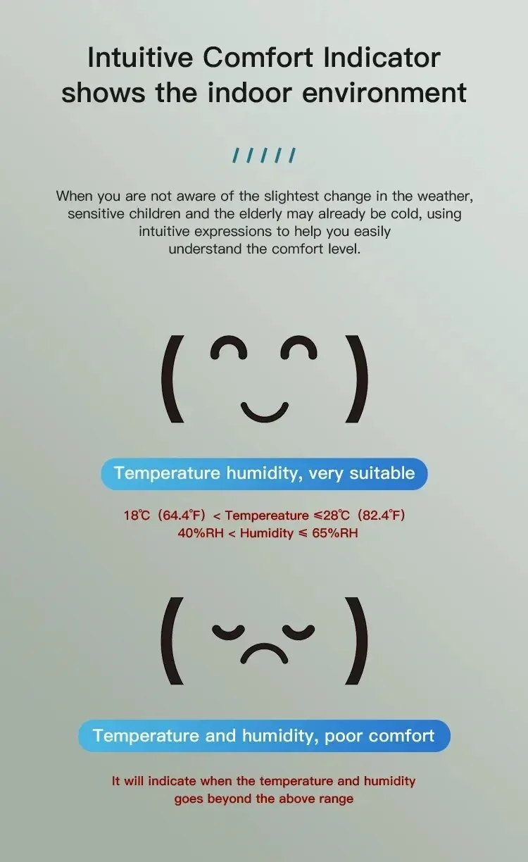 Cuando no está al tanto del más mínimo cambio en el clima, los niños sensibles y los ancianos pueden ya pasar frío, utilizando expresiones intuitivas para ayudarlo a comprender fácilmente el nivel de comodidad.