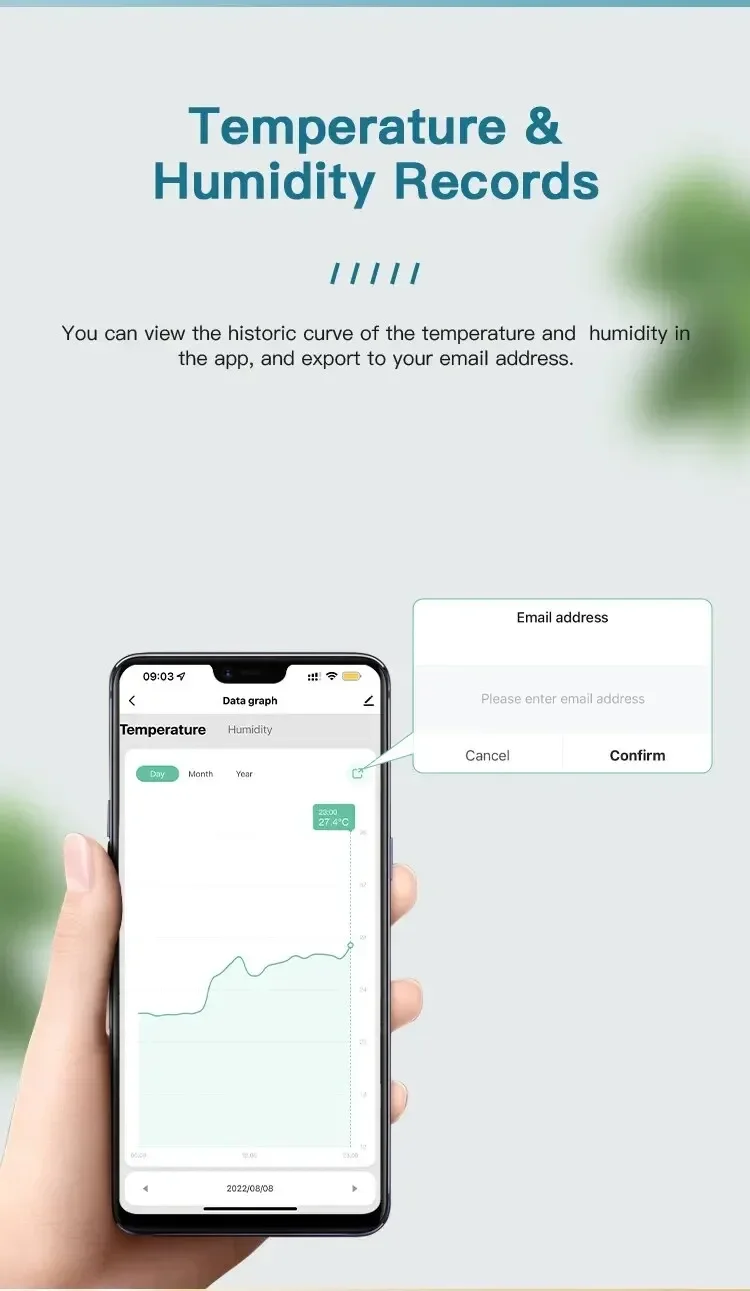 Puedes ver la curva histórica de temperatura y humedad en la aplicación y exportarla a tu correo electrónico.