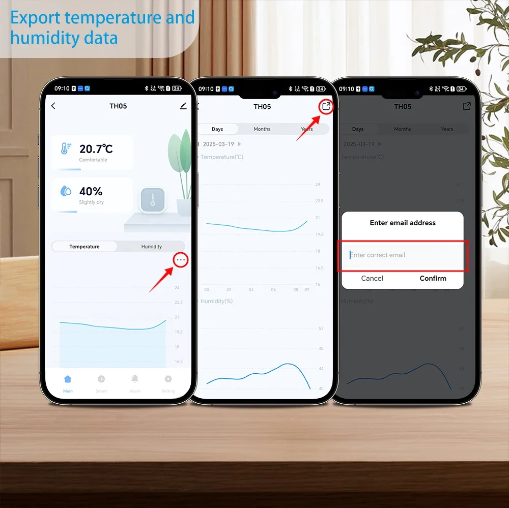 Puede ver la curva histórica de temperatura y humedad en la APLICACIÓN y exportarla a su correo electrónico.