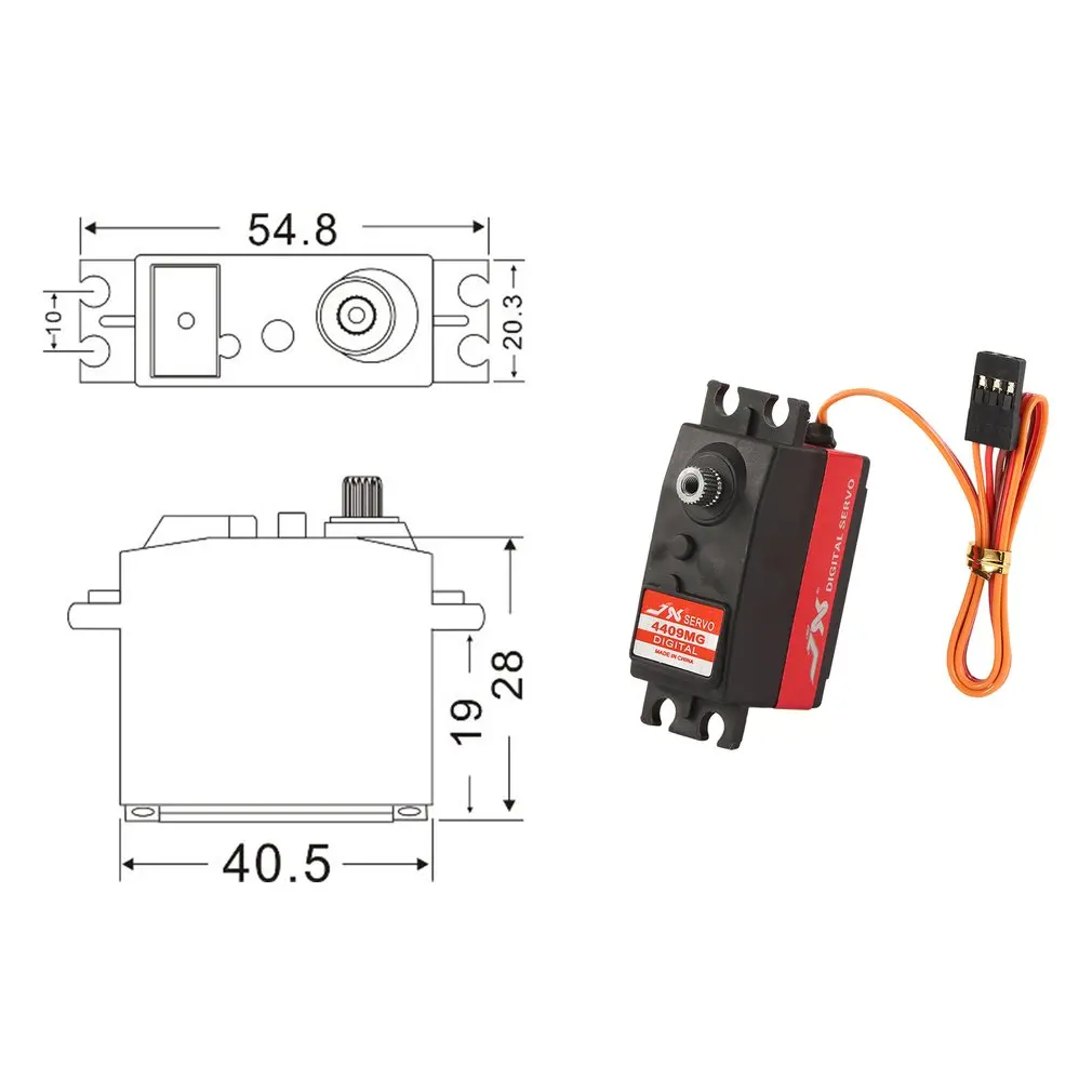 Características:Alto par: tamaño pequeño y peso ligero, pero el par de torsión podría ser de 9,2 kg durante el voltaje de entrada de 6V.Alta Velocidad: 0,13 segundos/60 ° durante el voltaje de 4,8 V y 0,11 segundos/60 ° durante el voltaje de entrada de 6V,Adecuado para muchos modelos rc: como robot rc, coche RC 1/8, avión, helicóptero, etc.Alta calidad y duradero, equipado con engranaje de metal, precisión y no fácil de planchar.El paquete incluye diferentes brazos servo para satisfacer sus necesidades.Descripción:Este servo de aluminio con torque de 9,2 kg es adecuado para muchos modelos rc como coche 1/8 RC, avión, helicóptero o robots. Reacciona muy rápidamente y soporta un voltaje de entrada de 4,8 ~ 6,0 V.Especificaciones:Marca: JXModelo: PDI-4409MGBanda muerta: 2 μsFrecuencia de trabajo: 1520μs / 330hzMotor: motor central de alta calidadVoltaje de funcionamiento: DC4.8 ~ 6,0 VVelocidad de funcionamiento (4,8 V): 0,13 segundos/60 °Velocidad de funcionamiento (6V): 0,11 seg/60 °Par de parada (4,8 V): 7,8 kg.cmPar de parada (6V): 9,2 kg.cmDimensiones: 40,5x20,3x28mmPeso: 44,5gLongitud del cable del conector: JR 260mmInformación del paquete:Tamaño del paquete: 6,2*4,9*3,8 cm/2,4*1,9*1, 5inPeso del paquete: 63g/2,23 ozPaquete de caja de regalo de marcaEl paquete incluye: