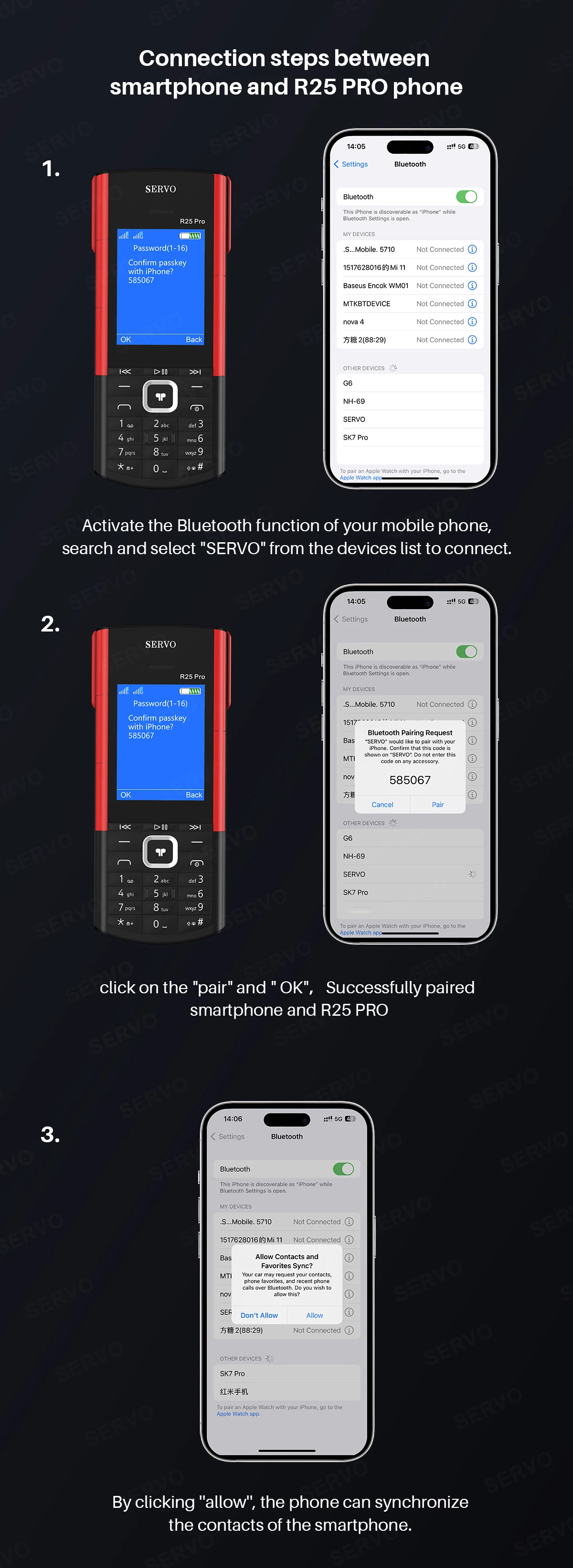 2. Active la función Bluetooth de tu teléfono móvil, busca y selecciona "SERVO" en la lista de dispositivos para conectarte.
