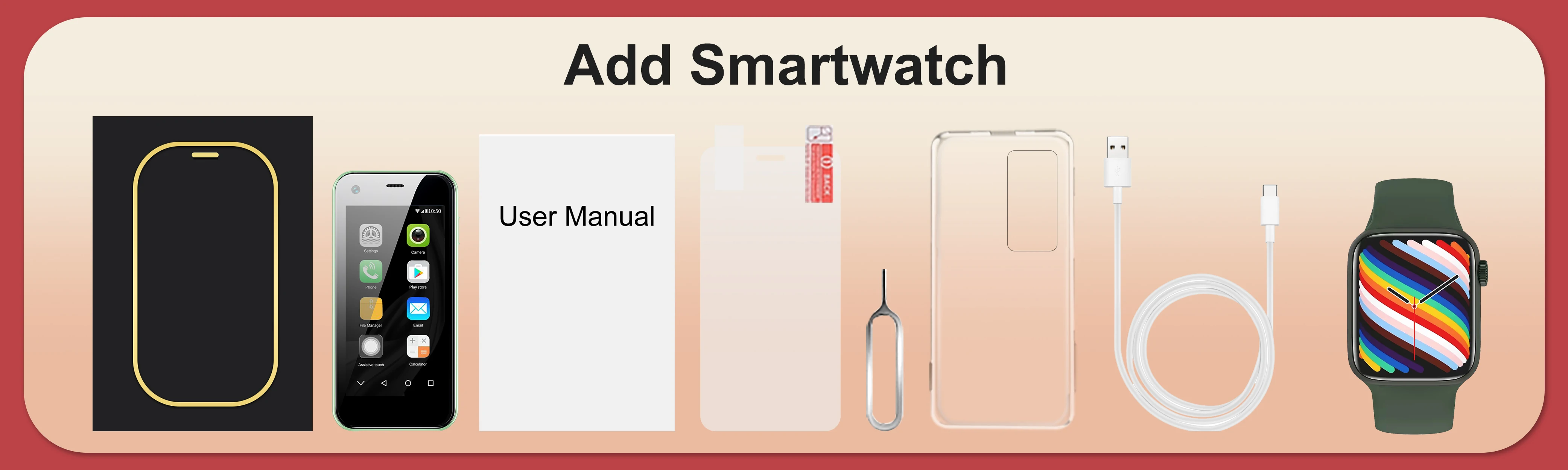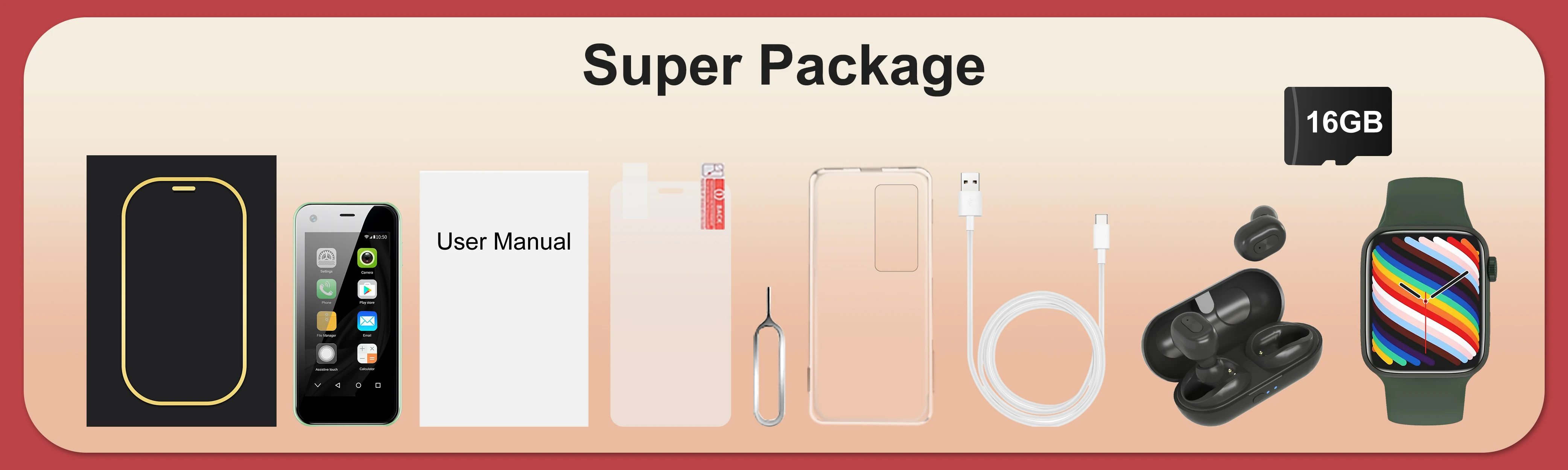 1 x teléfono (batería incluida),1 x cable de datos, 1 x aguja SIM, 1 x manual, 1 x funda (regalo gratis),1 x película protectora HD (regalo gratis),1 x reloj inteligente
