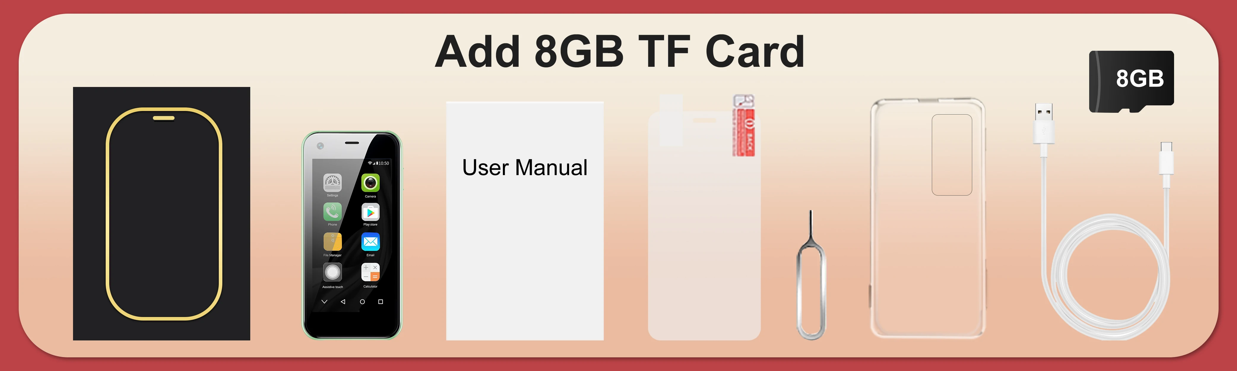 1 x teléfono (batería incluida),1 x cable de datos, 1 x aguja SIM, 1 x manual, 1 x funda (regalo gratis),1 x película protectora HD (regalo gratis),1 tarjeta de memoria de 8GB