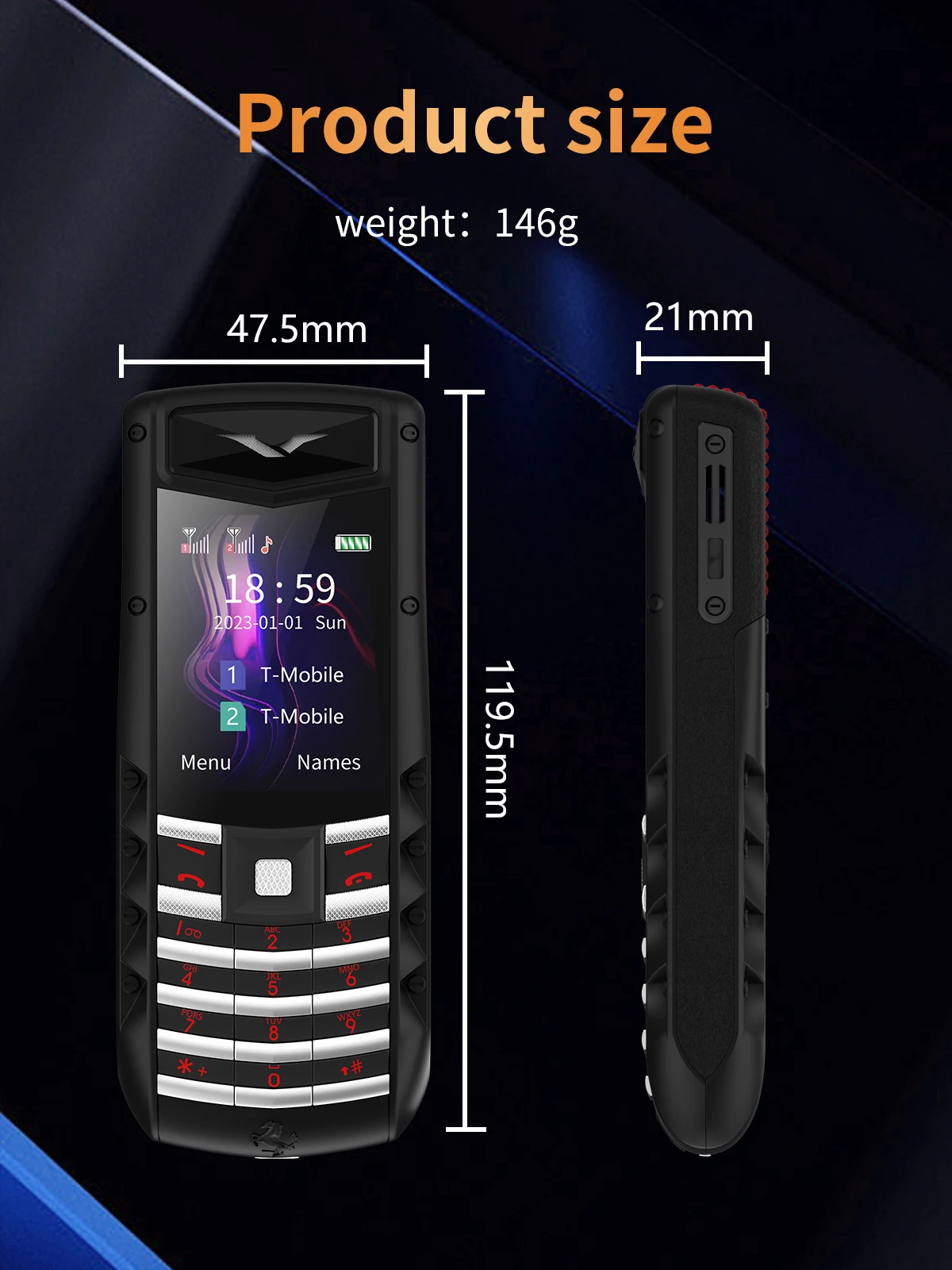 Tamaño del teléfono: 99,5*47,5*21 mm (peso 146 g)