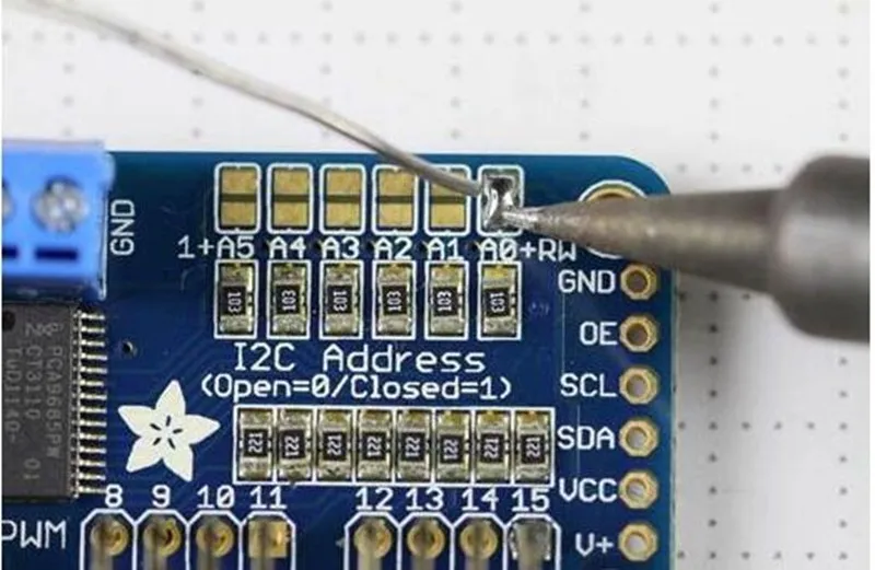 (4) Para la dirección asignada del tablero del conductor:Cada Placa de accionamiento de la cascada debe tener una dirección de acceso única. La dirección I2C inicial de cada placa de controlador es 0 × 40, puede modificar la esquina superior derecha de la dirección I2C del puente. Conecte un puente con soldadura para indicar un número binario "1".