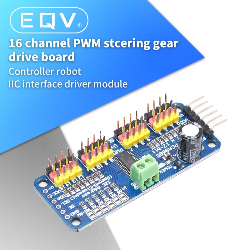 Dimensiones (sin cabezales ni bloque de terminales) 2,5 "x 1" x 0,1 "(62,5mm x 25,4mm x 3mm)Peso (sin cabezales ni bloque de terminales): 5,5 gramosPeso (con cabezales 3x4 y bloque de terminales): 9 gramosEsta placa/chip utiliza una dirección I2C de 7 bits entre 0-0x60x80, seleccionable con puentesBloque de terminales para la entrada de energía (o puede usar las conexiones de 0,1 "en el lateral)Protección de polaridad inversa en la entrada del bloque de terminalesEnergía verde-Buen LEDConectores de 3 pines en grupos de 4 para que pueda conectar 16 servos a la vez (los servoenchufes son ligeramente más anchos que 0,1 ", por lo que solo puede apilar 4 uno al lado del otro en el cabezal de 0,1"Diseño "encadenado"Un lugar para colocar un condensador grande en la línea V + (en caso de que lo necesite)Resistencias de la serie de 220 ohmios en todas las líneas de salida para protegerlas y hacer que los LED de conducción sean trivialesPuentes de soldadura para los 6 pines de selección de direcciónControlador PWM con reloj integrado, de la marca, de la marca. A diferencia de la familia TLC5940, no es necesario enviar continuamente señal de atar su microcontrolador, ¡su funcionamiento es completamente libre!Cumple con 5V, lo que significa que puede controlarlo desde un microcontrolador de 3,3 V y aún así conducir de forma segura hasta salidas de 6V (esto es bueno para cuando desea controlar LED blancos o azules con más de 3,4 voltajes de avance)6 pines de selección de dirección para que pueda cablear hasta 62 de estos en un solo bus I2C, un total de 992 salidas, es decir, muchos servos o LEDFrecuencia ajustable PWM hasta aproximadamente 1,6 KHzResolución de 12 bits para cada salida: para los servos, eso significa una resolución de aproximadamente 4us y una tasa de actualización de 60 Hz.Salida Push-Pull configurable o de drenaje abiertoLa salida habilita el PIN para desactivar rápidamente todas las salidasInstrucciones de uso