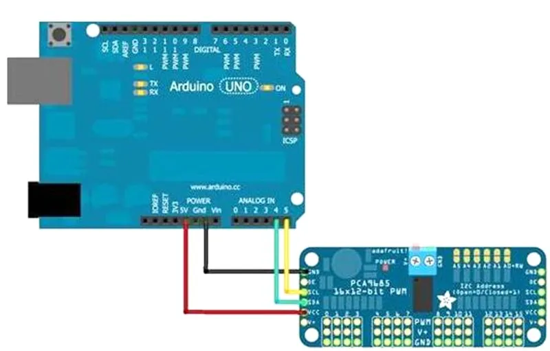 Tablero 0: Dirección=0x40Offset=binario 00000 (predeterminado)Placa 1: Dirección=0x41 Offset=binario 00001 (como se muestra arriba, conectado a A0)Tablero 2: Dirección=0x42 Offset=binario 00010 (Conectar a A1)Placa 3: Dirección=0x43 Offset=binario 00011 (conecte A0 y A1)Placa 4: Dirección=0x44 Offset=binario 00100 (Conectar a A2)Y así sucesivamente. . .Ejemplo de código:# Incluir Wire. H # Incluir Adafruit_PWMServoDriver.h Adafruit_PWMServoDriver pwm1=Adafruit_PWMServoDriver (0 × 40);Adafruit_PWMServoDriver pwm2=Adafruit_PWMServoDriver (0x41);Configuración nula () {Serie. inicio (9600);Serial.println ( "16 canales¡Prueba PWM! ");Pwm1.begin ();Pwm1.setPWMFreq (1600); //Esta es la frecuencia máxima PWMPwm2.begin ();Pwm2.setPWMFreq (1600); //Esta es la frecuencia máxima PWM