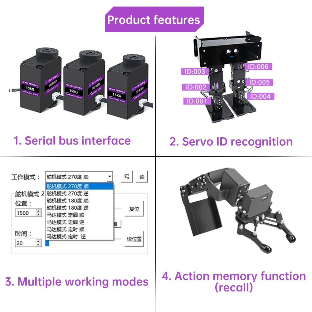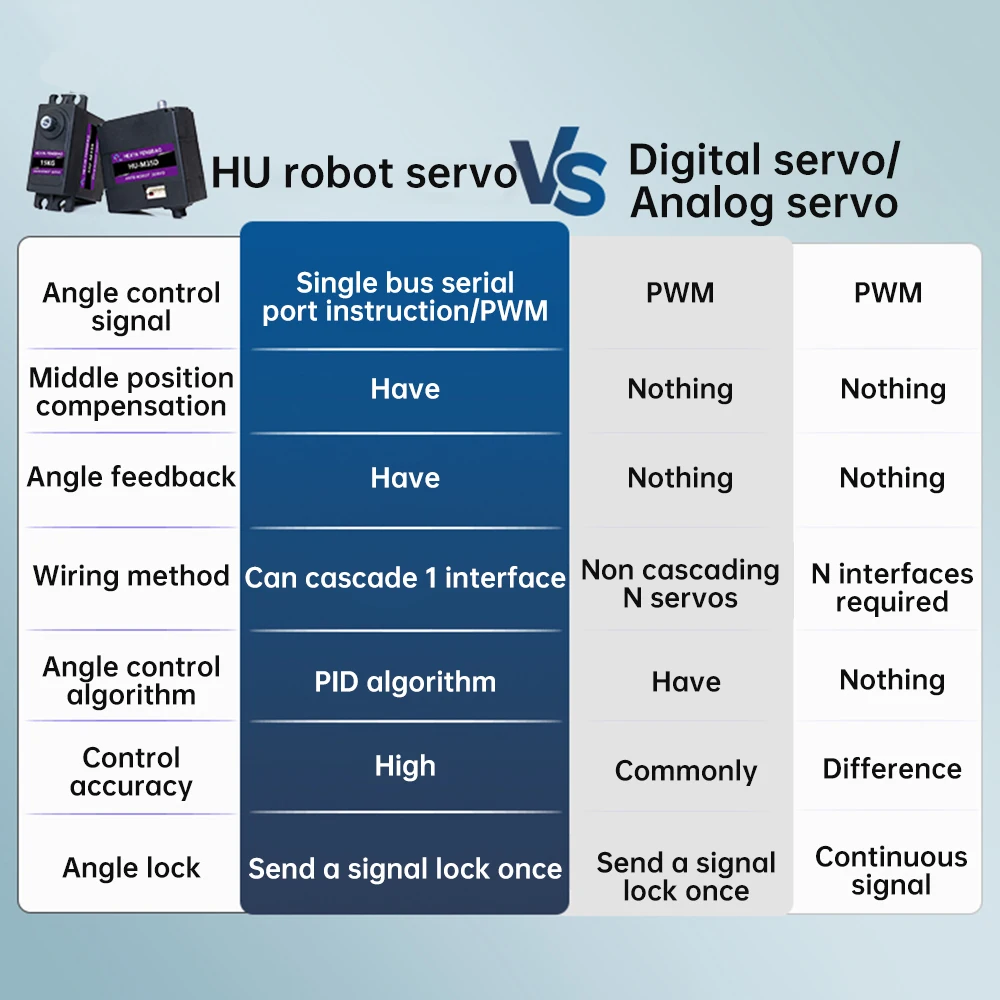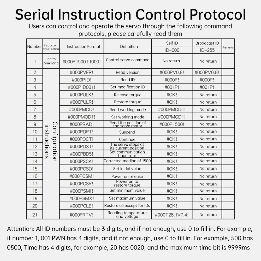 Característica: 1. La Placa de control conduce el puerto serie para conectar el engranaje de dirección del bus, y el engranaje de dirección se conecta hacia arriba y hacia abajo a través de la interfaz doble, lo que puede reducir la ocupación del puerto serie. El cableado simple hace que el producto sea más conveniente y hermoso 2. El engranaje de dirección tiene la función del bus de retroalimentación de ángulo y memoria de acción, que puede leer rápidamente el ángulo del engranaje de dirección, capturar la acción del robot y simplificar la programación de acción del robot 3. Con la retroalimentación de temperatura y voltaje, puede enviar comandos directamente para leer, comprender en tiempo real los datos internos del engranaje de dirección y proteger el engranaje de dirección. 4. Engranaje totalmente metálico, engranaje metálico con mayor fuerza, alta precisión, posición virtual pequeña, lo que aumenta en gran medida la resistencia al desgaste y la vida útil El diseño de alto par de 5,15 KG viene con un motor de alto rendimiento para facilitar la rotación y alimentar su robot 6. Amplia gama de uso, adecuado para robot de Múltiples articulaciones, brazo robótico, coche inteligente, enseñanza y educación, Competencia Profesional Parámetro: Nombre del producto: engranaje de dirección de autobús de 15KG (engranaje de dirección de autobús de un solo eje/engranaje de dirección de autobús de doble eje opcional) Tamaño del producto: aproximadamente 40*20*40,5mm Velocidad de rotación: 0,16 segundos/60 °(6V sin carga) Precisión del engranaje de dirección: precisión teórica 0,24 Tipo de engranaje: Metal Voltaje de alimentación: Par: 15kg.cm (6,6 V) Ángulo de rotación: máximo 270 (velocidad ajustable) Corriente de bloqueo: 2A Corriente de trabajo: máx. 2A Protección contra sobrecalentamiento: 50 ℃ Engranaje de dirección D: 0-254 Ajustes de usuario Modo del motor: Sincronización/ciclo fijo Función de lectura posterior: compatible Longitud del cable de soporte: Bus estándar de 15 cm Tasa de baudios: 115200 Modo de control: Control de comando serie Retroalimentación de parámetros: temperatura, voltaje, posición Paquete incluido: Servo de bus serie inteligente de 1x15KG, Servomotor de Metal de un solo/doble eje, brazo de Robot, instrumento de prueba de Servo de alto par en serie Asuntos que requieren atención 1. Modo de cableado. El Dispositivo de bus se puede conectar en serie o de forma independiente a la interfaz de bus de la placa de control. 2. Configuración de ID, El ID predeterminado del engranaje de dirección es 0, el usuario debe cambiar el ID antes de usarlo, de modo que el número de ID de cada engranaje de dirección sea diferente, de lo contrario, todo el engranaje de dirección se moverá al mismo tiempo después de que el engranaje de dirección esté conectado en serie. Si desea que cada dispositivo de bus funcione de forma independiente, debe establecer un ID diferente. 3. No conecte el engranaje de dirección en serie cuando se modifique el ID. Conecte el engranaje de dirección en serie después de que se modifique el ID de todo el engranaje de dirección. 4. Porque nuestro mecanismo de dirección es de control de bus único, es decir, los datos se envían y se leen a través de un cable. Si el usuario necesita controlar el engranaje de dirección, simplemente conecte el TXD de un solo chip al puerto de señal del engranaje de dirección, Y la fuente de alimentación del engranaje de dirección y GND están normalmente conectados (la fuente de alimentación del engranaje de dirección no puede ser alimentada por el puerto USB del ordenador, recuerde, el engranaje de dirección es un producto de alta corriente, Se recomienda elegir una batería de polímero de litio de 7,4 V para la fuente de alimentación del engranaje de dirección). Si necesita leer el ángulo, puede cortocircuitar directamente el MCU RXD, TXD. Con el fin de facilitar las pruebas y el control de nuestro propio microcontrolador, hemos desarrollado una placa UART de un solo cable a doble cable, que es conveniente para probar y conectar al microcontrolador del usuario.