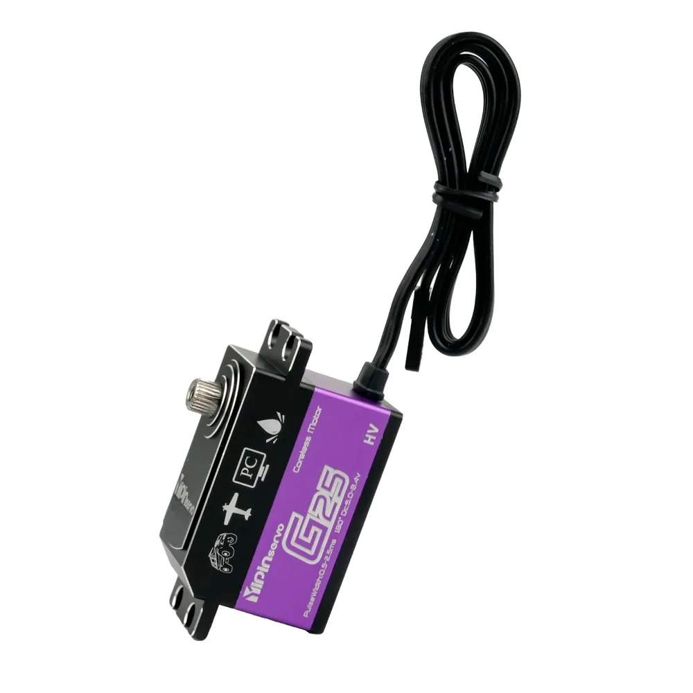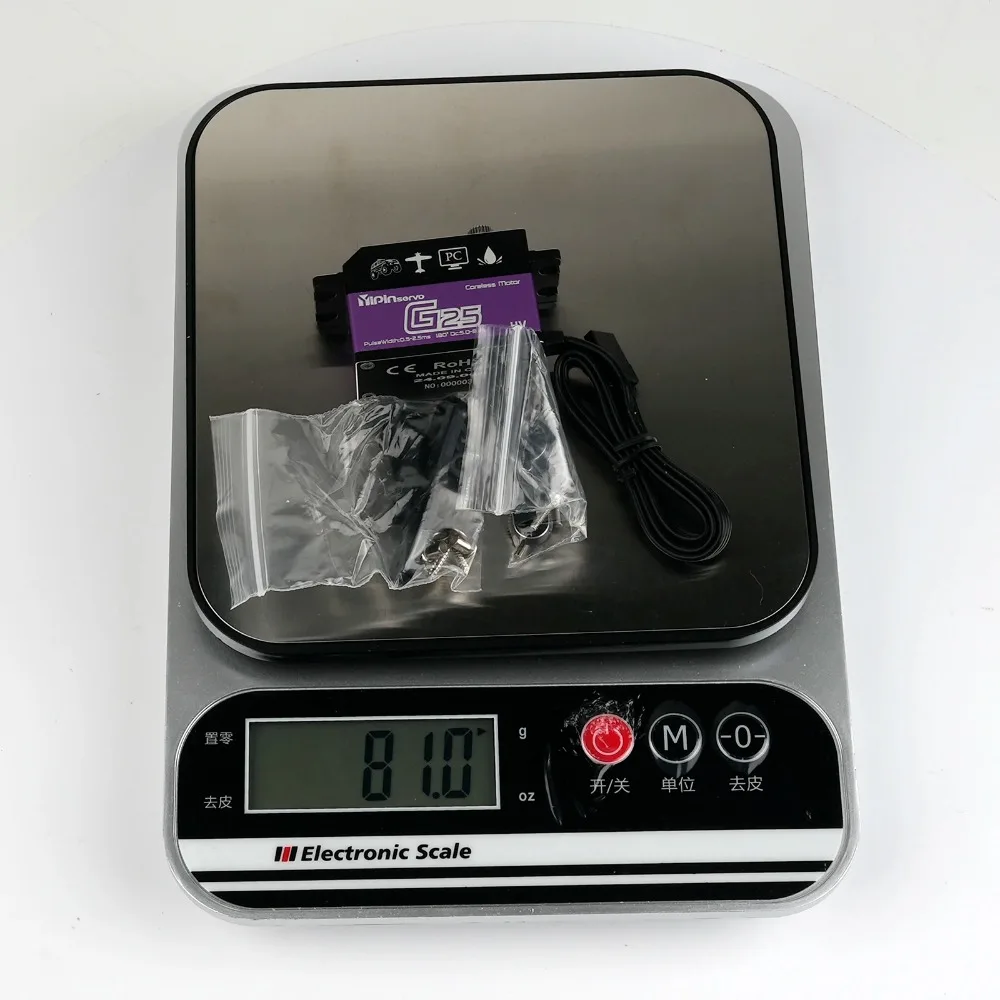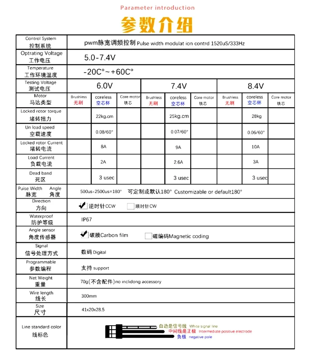 Servos RC con Motor sin núcleo de alto par, servo Digital de 7,4V y 25KG para escalar rocas, modelo de coche, Robot, Servo Industrial DIY 180°/270°/360°Especificación Voltaje de funcionamiento 6,0 V-8,4 V Corriente de espera ≤20mA Corriente de parada 6,0 V ≤8A 7,4 V ≤9A 8,4 V ≤10A Sin velocidad de carga 6,0 V ≤0,08seg/60° 7,4 V ≤0,07seg/60° 8,4 V ≤0,06seg/60° Máx.Par 6,0 V ≥22 kgf.cm 7,4 V ≥25 kgf.cm 8,4 V ≥28 kgf.cm Dirección de rotación CCW(500-2500us) Rango de ancho de pulso 500-2500us Posición neutra 1500us Ángulo de viaje de funcionamiento 180±10'(500-2500us) Ángulo de recorrido máximo y de funcionamiento 358°+10*(500-2500us) Ángulo de tiempo mecánico 360° Ancho de banda muerta ≤ 3 nosotros Rango de temperatura operativo -20℃-+80℃ Rango de temperatura de almacenamiento -20℃-+60℃ Peso 70 gramos tamaños 41x20x28,5mm Material de la caja Aleación de aluminio Material del juego de engranajes Engranaje de metal Tipo de motor Motor sin núcleo