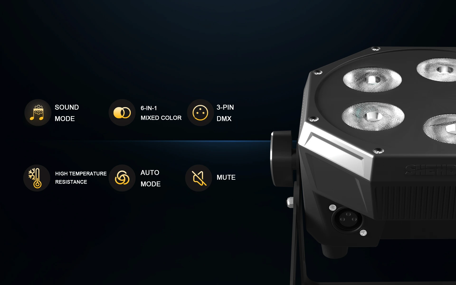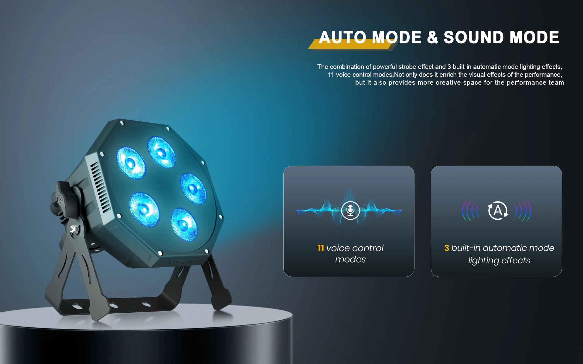 La combinación de un potente efecto estroboscópico y 3 efectos de iluminación de modo automático integrados, 11 modos de control por voz,